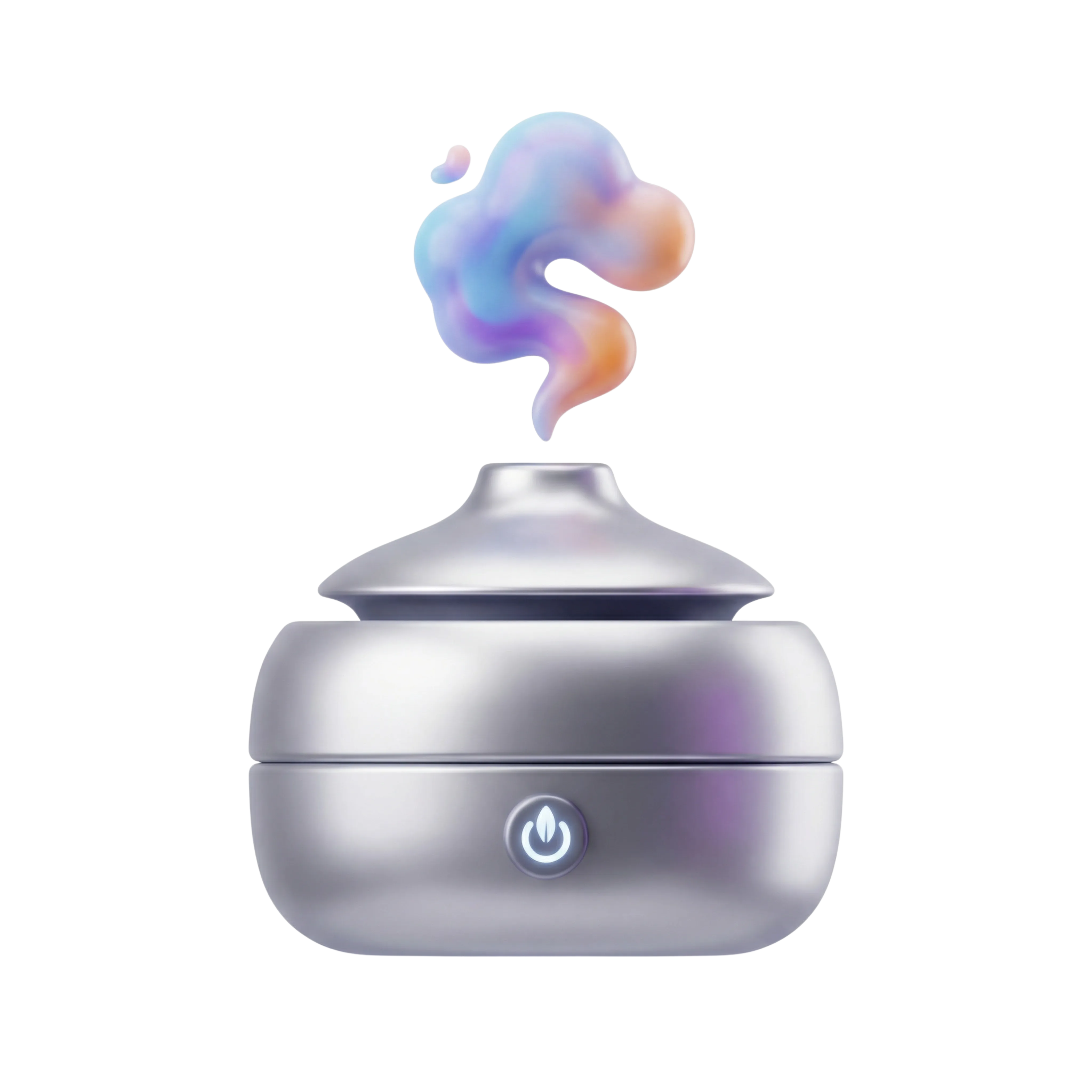 A detailed 3D render of a modern electric bukhoor burner with a sleek metallic finish, featuring a soft power button and colorful aromatic vapor. Ideal for use in digital product showcases, home fragrance branding, or cultural lifestyle apps representing traditional incense burning in a contemporary form.