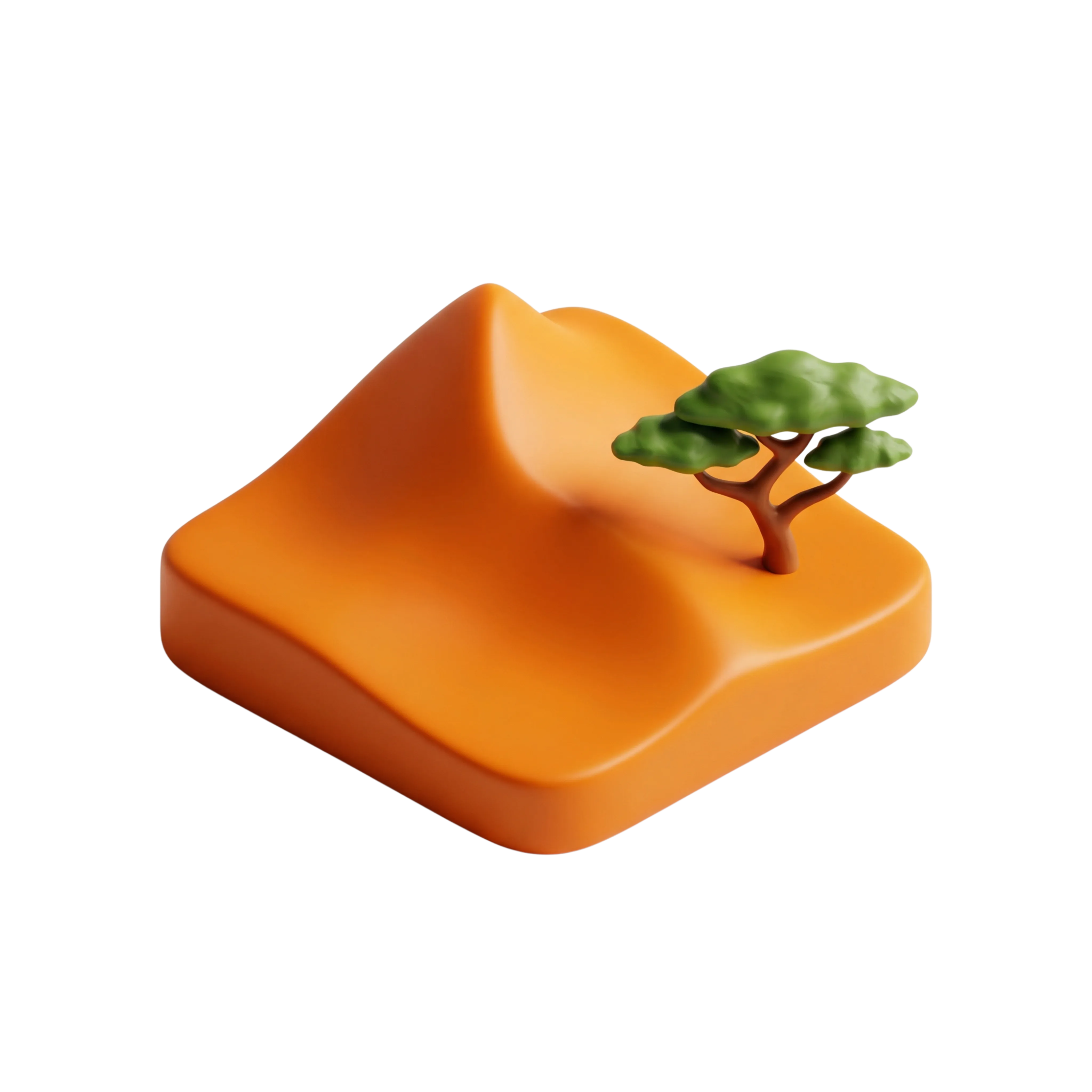 A minimalistic 3D model featuring a stylized desert sand dune with smooth matte finish and a single green tree. Ideal for environmental icons, geography-related apps, or Middle Eastern themed infographics.