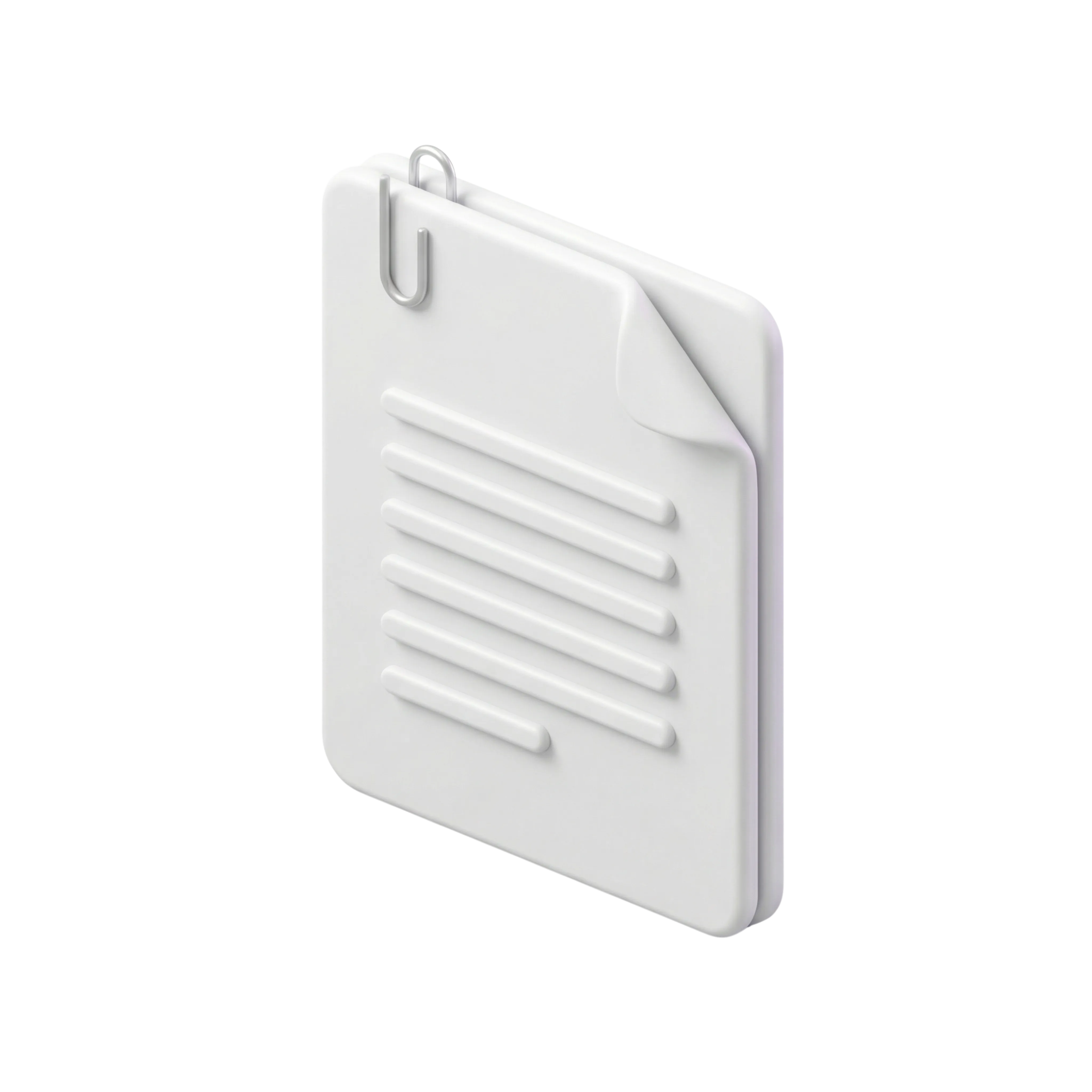 A high-quality 3D render of a minimalist file icon featuring a matte white surface with raised lines resembling text and a small metal paper clip. Ideal for UI/UX mockups, productivity applications, and digital dashboard designs.