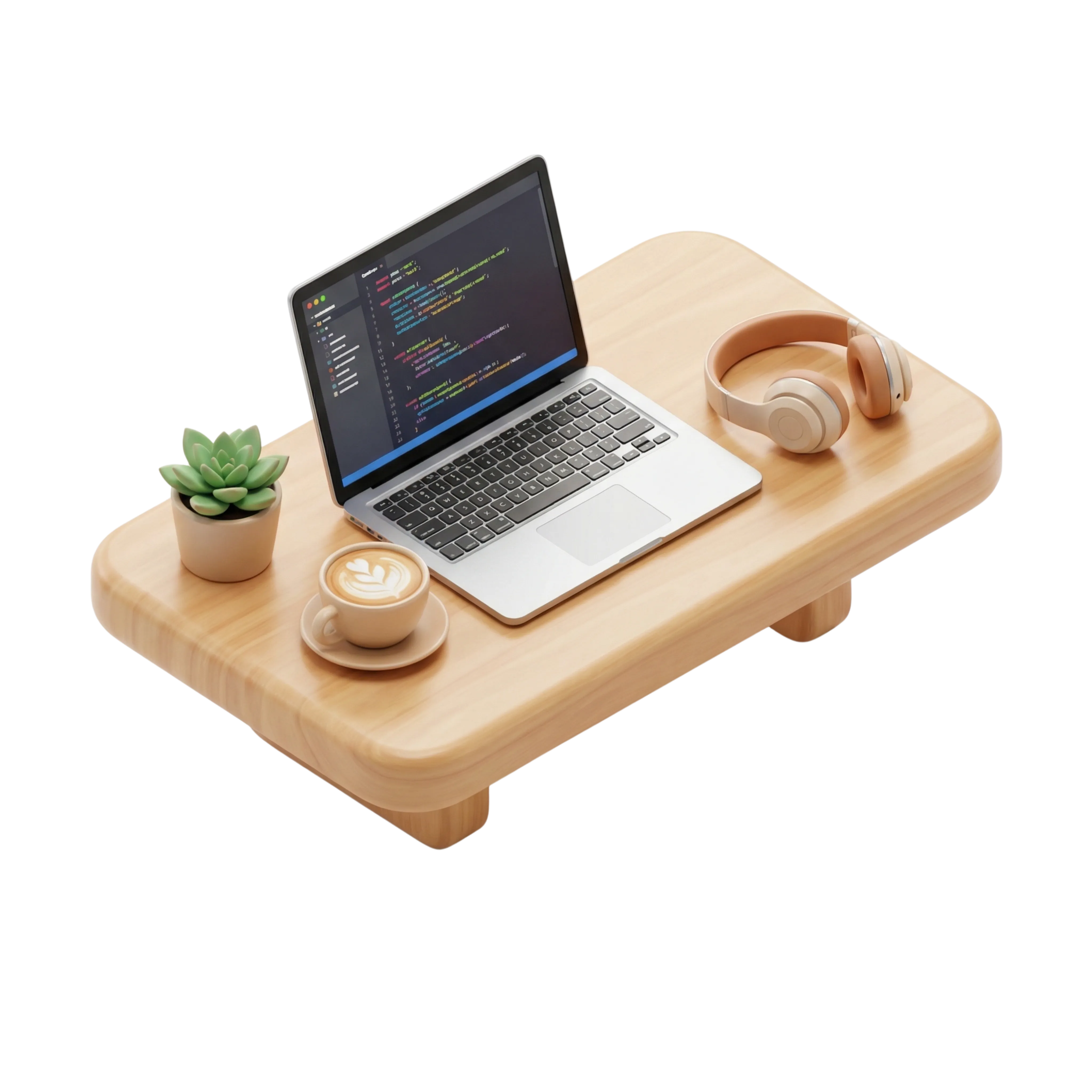 مجسم ثلاثي الأبعاد عالي الجودة لمكتب عمل بسيط يحتوي على كمبيوتر محمول يعرض كود برمجي، كوب قهوة مزين باللاتيه، سماعات رأس فوق الأذن، ونبتة زينة صغيرة. سطح المكتب مصنوع من خشب غير لامع مع حواف دائرية، مثالي لتصاميم واجهات التطبيقات المتعلقة بالإنتاجية أو مساحات العمل الرقمية.