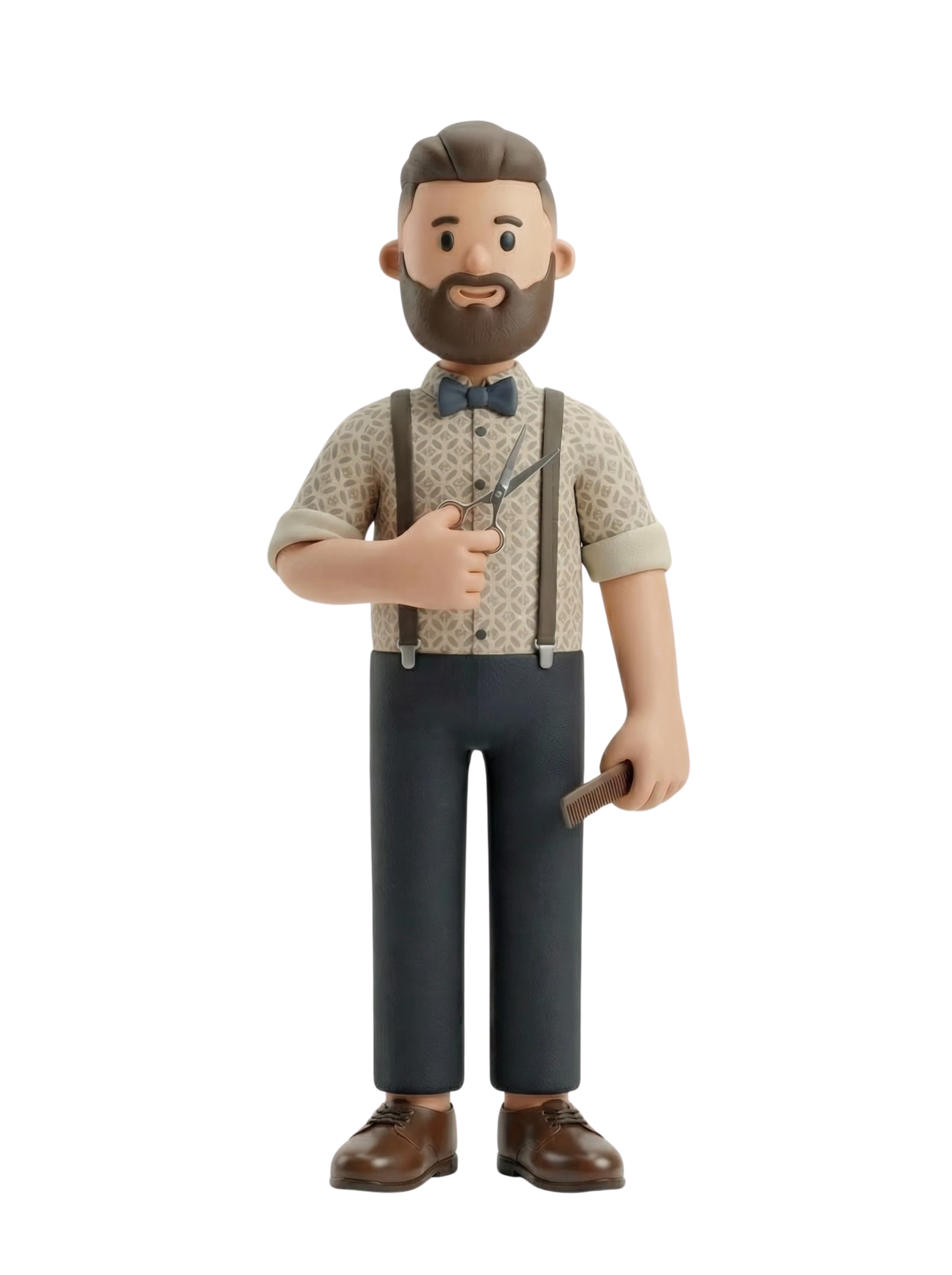 A trendy barber ready for precision grooming, featuring a well-groomed beard, vintage suspenders, and tools in hand, capturing the blend of classic style and modern grooming culture.