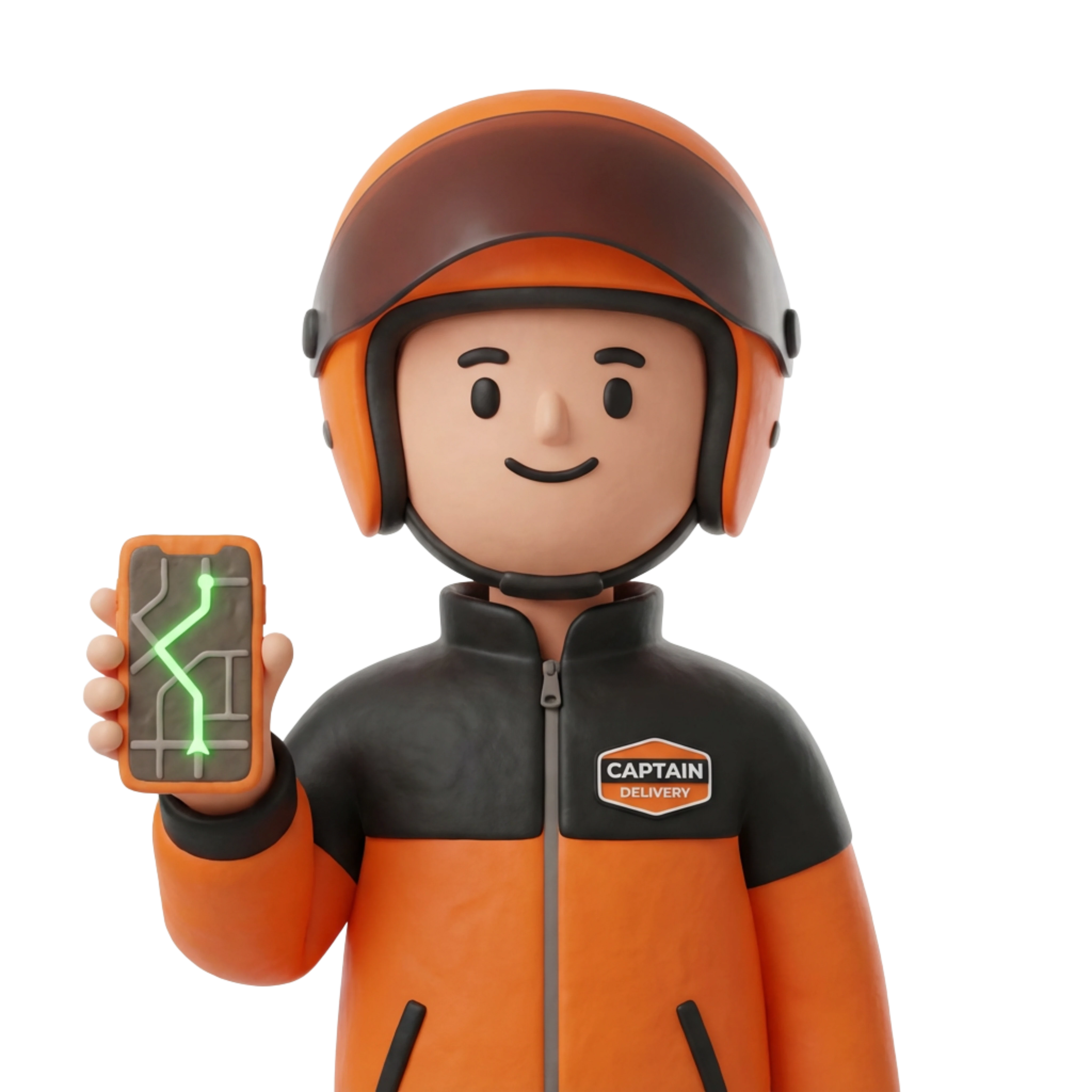 سائق توصيل مبتهج يعرض تطبيق الملاحة على هاتفه الذكي، مستعد لإتمام مهمته التالية بسرعة ودقة، مما يعكس لوجستيات التوصيل الحديثة في المدن.