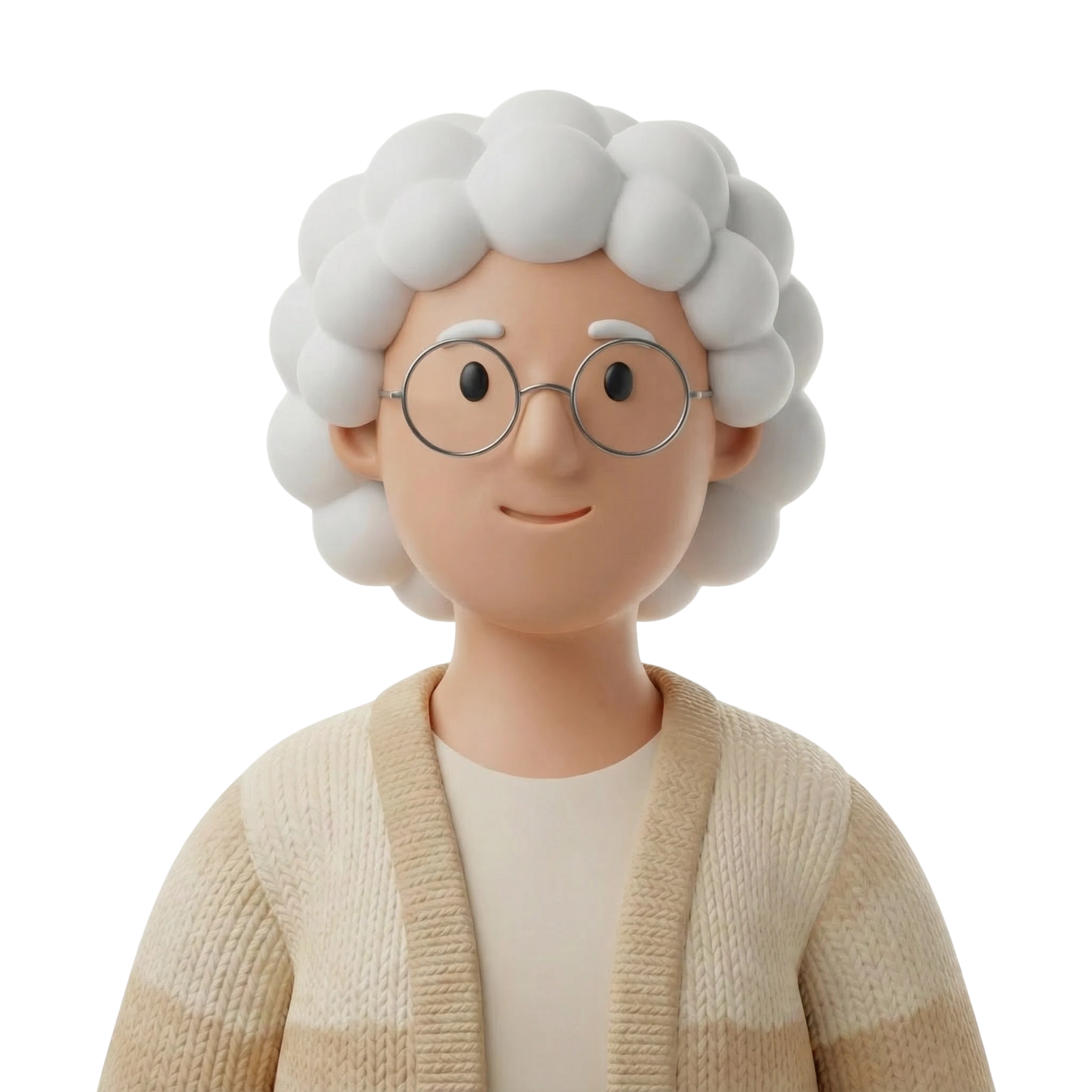 جدة عصرية وحنونة تظهر بملابس مريحة على الطراز الغربي، تجسد الحنان والحكمة والرعاية العائلية.