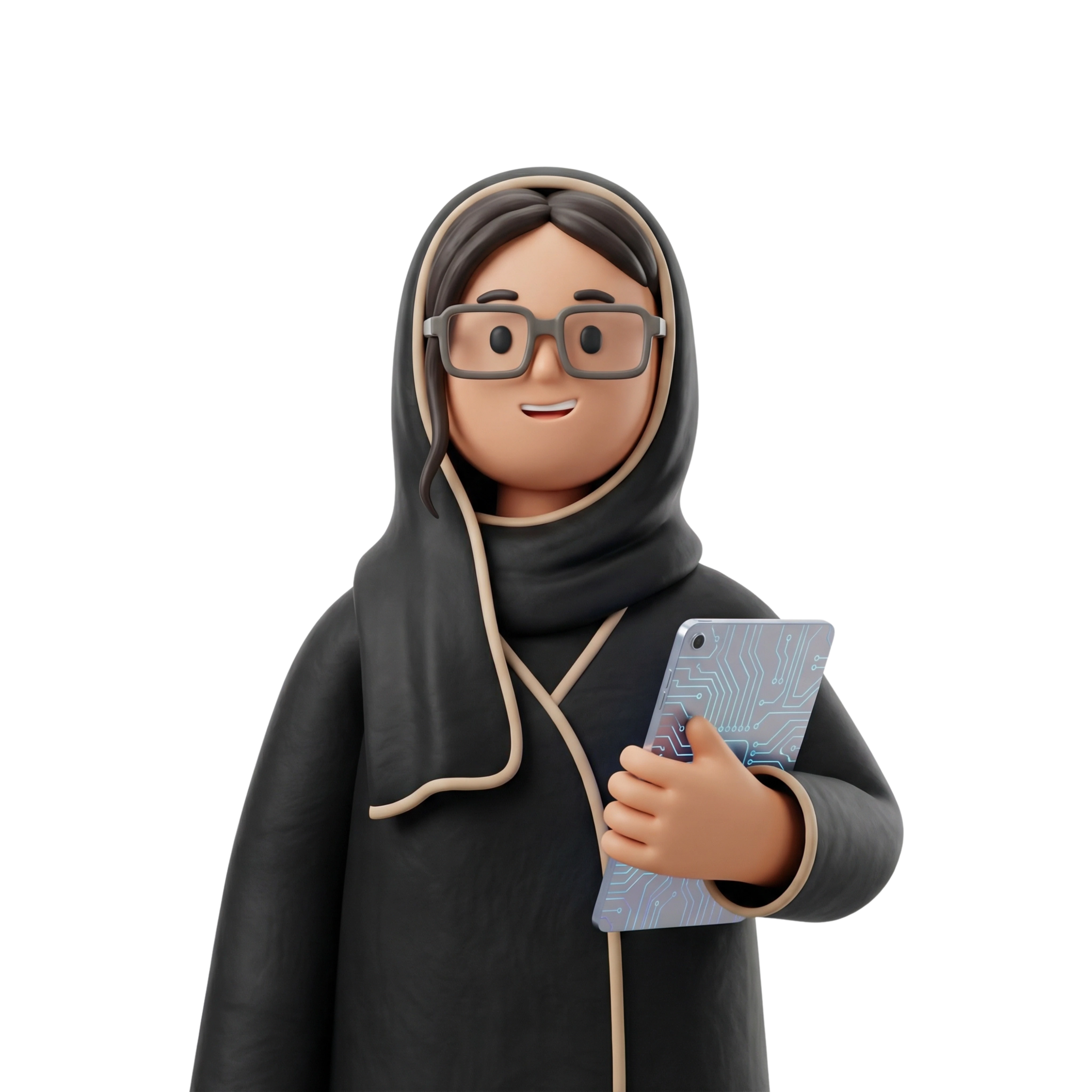 سيدة أعمال طموحة تمسك بجهاز لوحي رقمي، تعكس دورها البارز في مجال التكنولوجيا وريادة الأعمال في منطقة الخليج.
