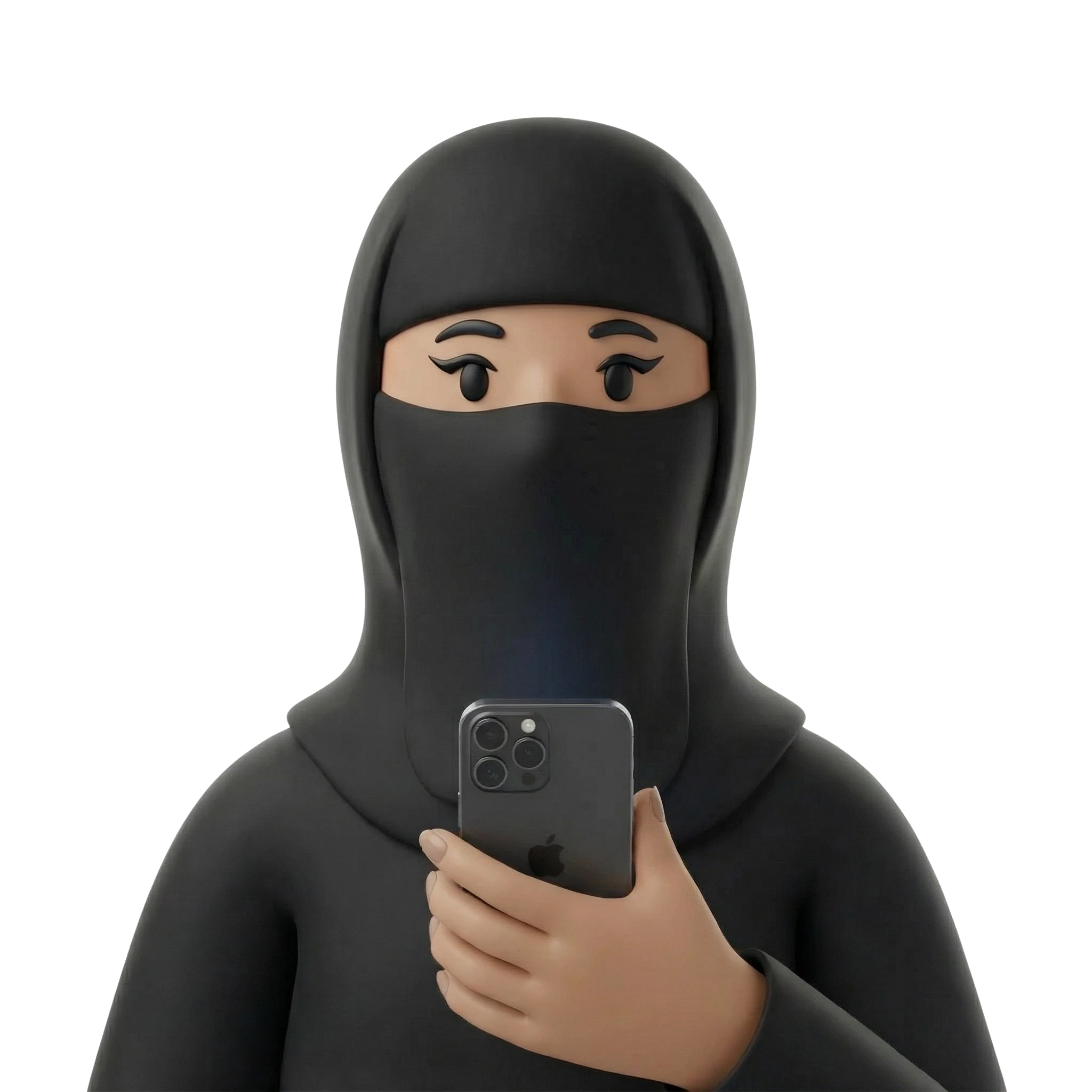 امرأة خليجية عصرية تتواصل رقمياً عبر هاتفها الذكي، تمثل مزيجاً من الحشمة التقليدية والهوية المواكبة للتقنية الحديثة.