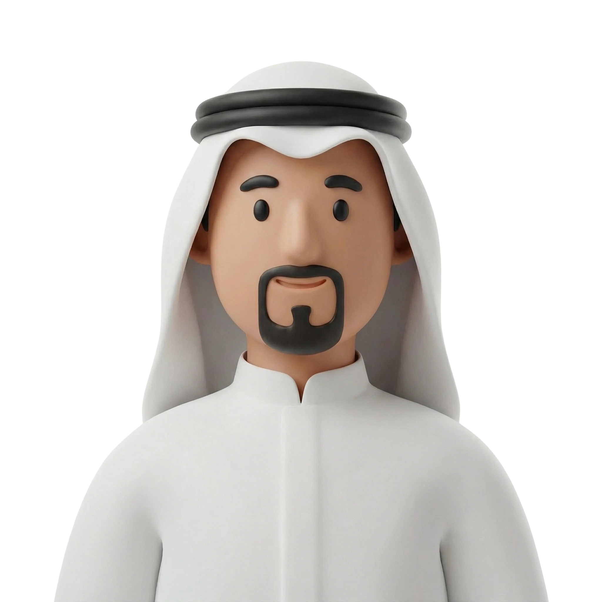 محترف خليجي هادئ وواثق يظهر بالزي التقليدي، يجسد الفخر الثقافي والهوية العصرية في بيئة الأعمال.