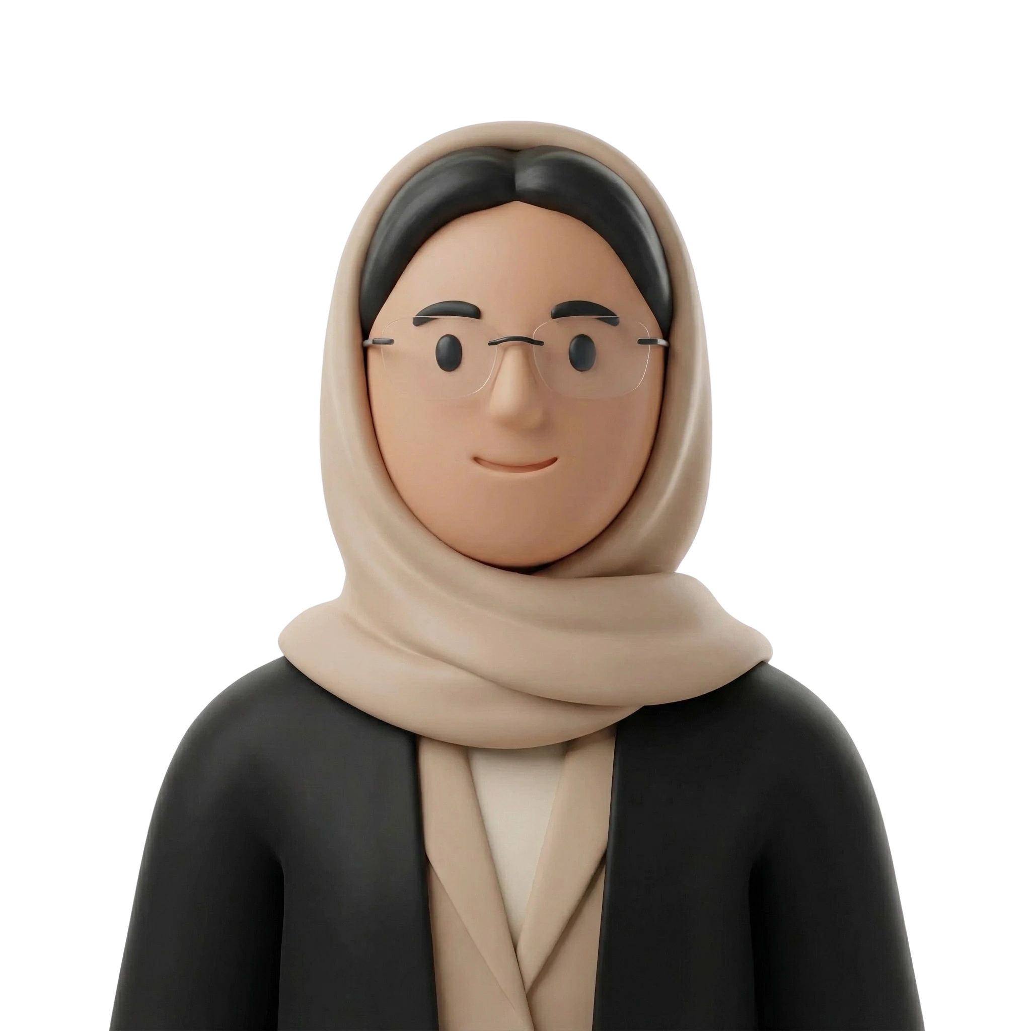 A professional Saudi businesswoman character wearing a modern beige hijab and sleek black abaya, representing leadership and empowerment in the corporate world.