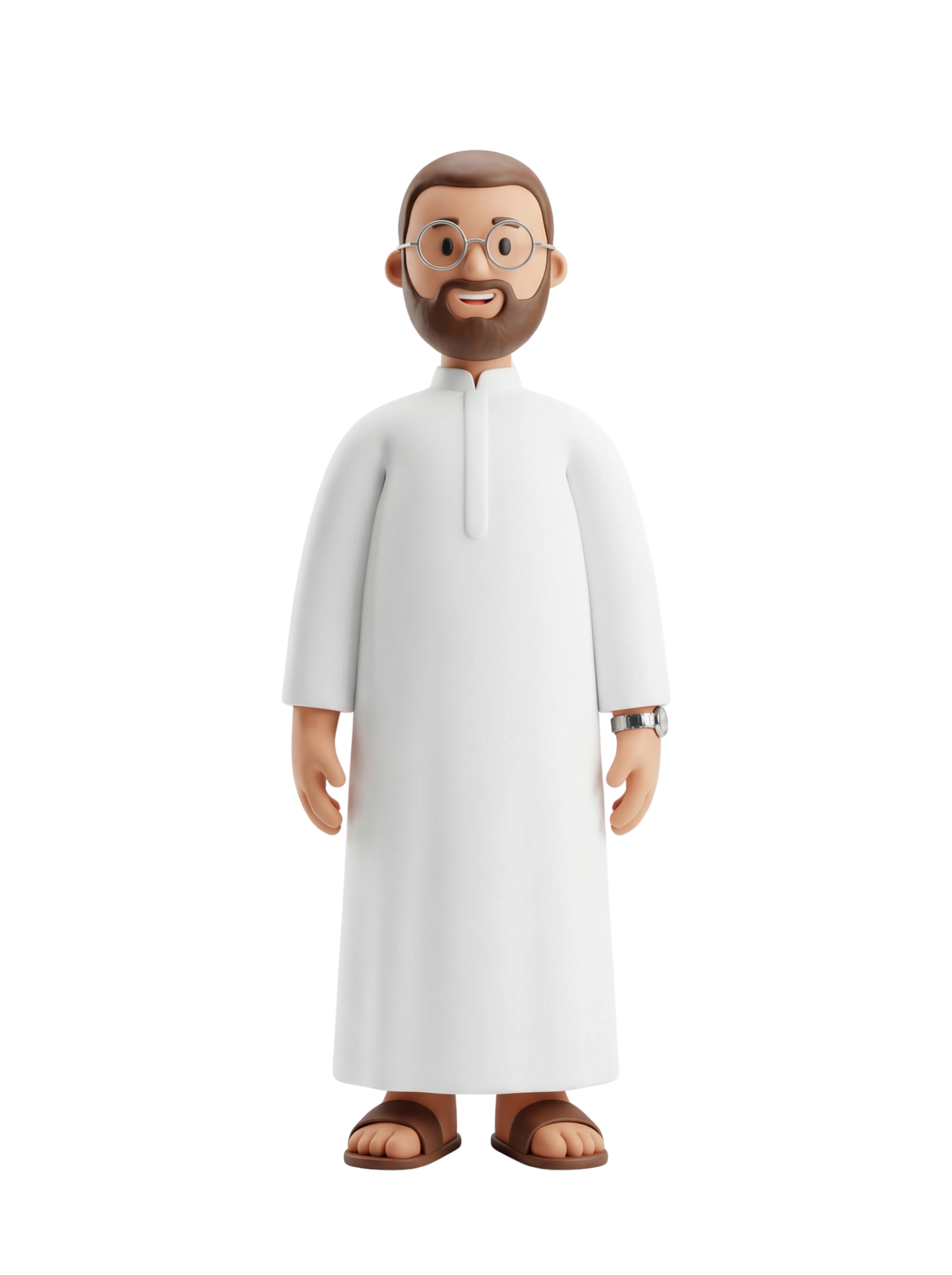 محترف سعودي مبتسم يرتدي ثوبًا أبيض تقليديًا، يقف بثقة وهو يضع ساعة يد عصرية ونظارات، مما يعكس مزيجًا من الأصالة والتراث مع أسلوب حياة عصري.