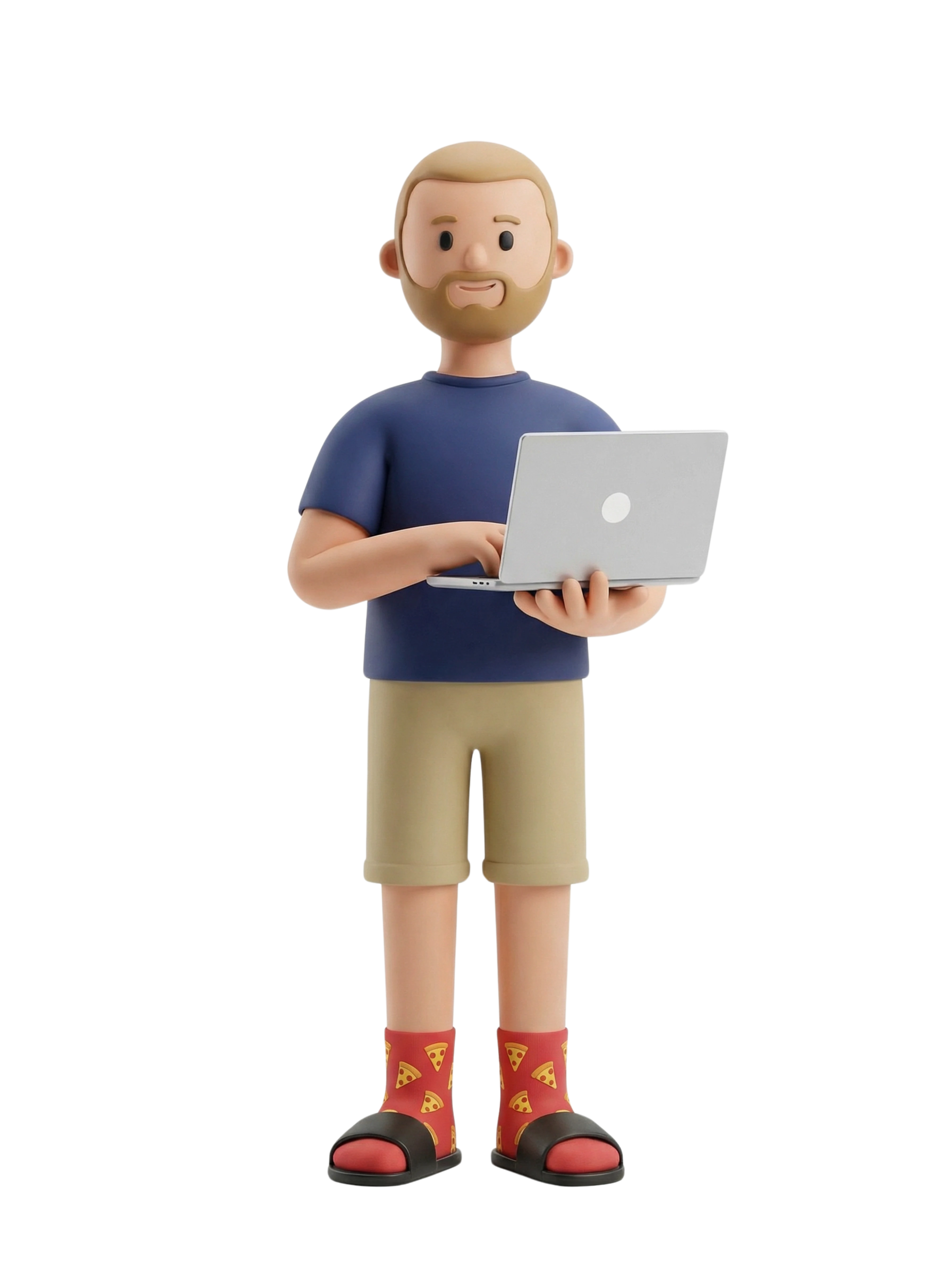 A focused tech specialist actively working on his laptop, dressed in a laid-back style that reflects a modern digital nomad's work-from-anywhere lifestyle.