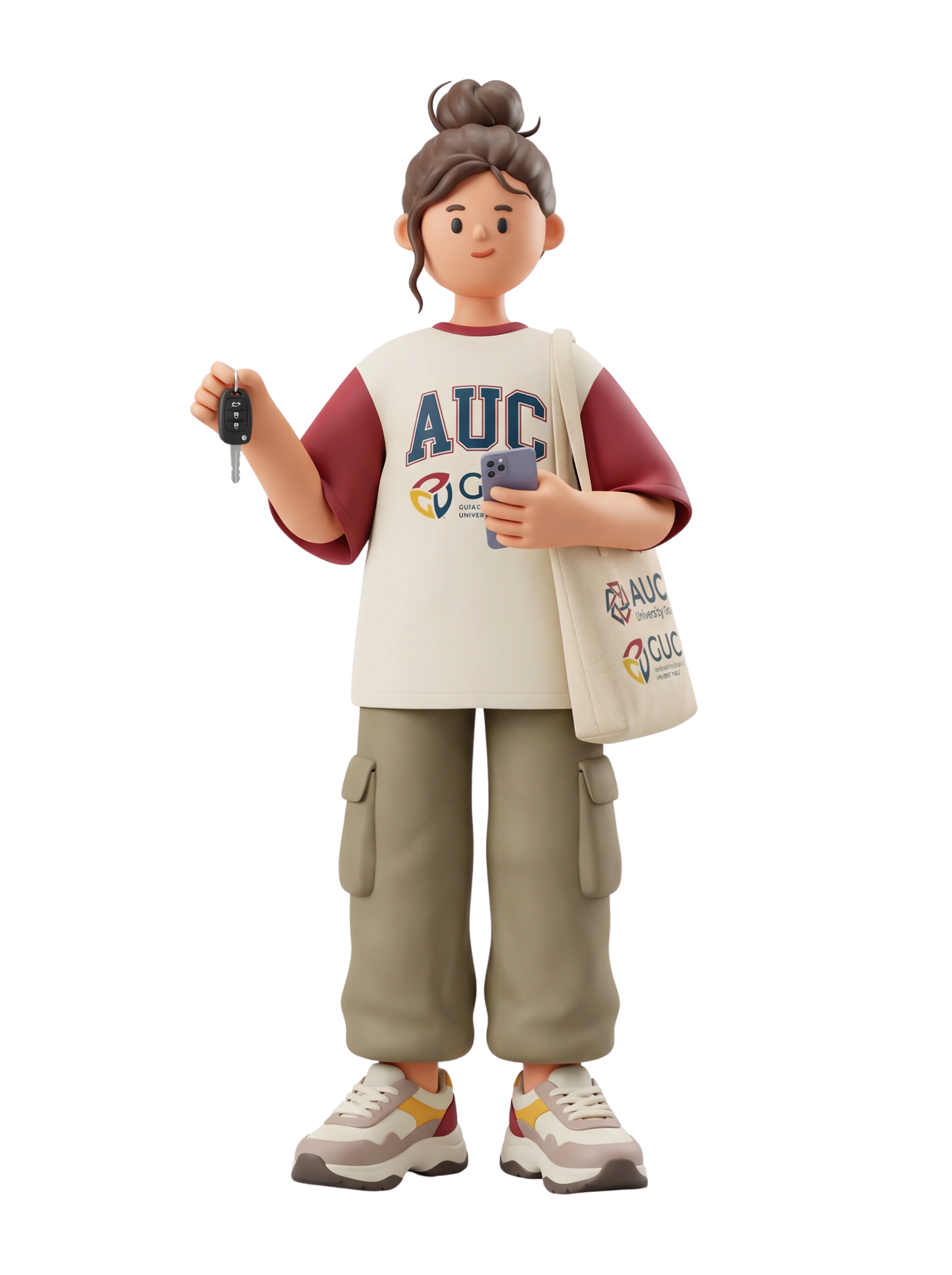 طالبة جامعية واثقة بإطلالة كاجوال تستعد لحياة الحرم الجامعي، تحمل مفاتيح السيارة وهاتفاً ذكياً وحقيبة قماشية بشعار الجامعة، مما يعكس ثقافة أكاديمية عصرية واستقلالية الطالبات.