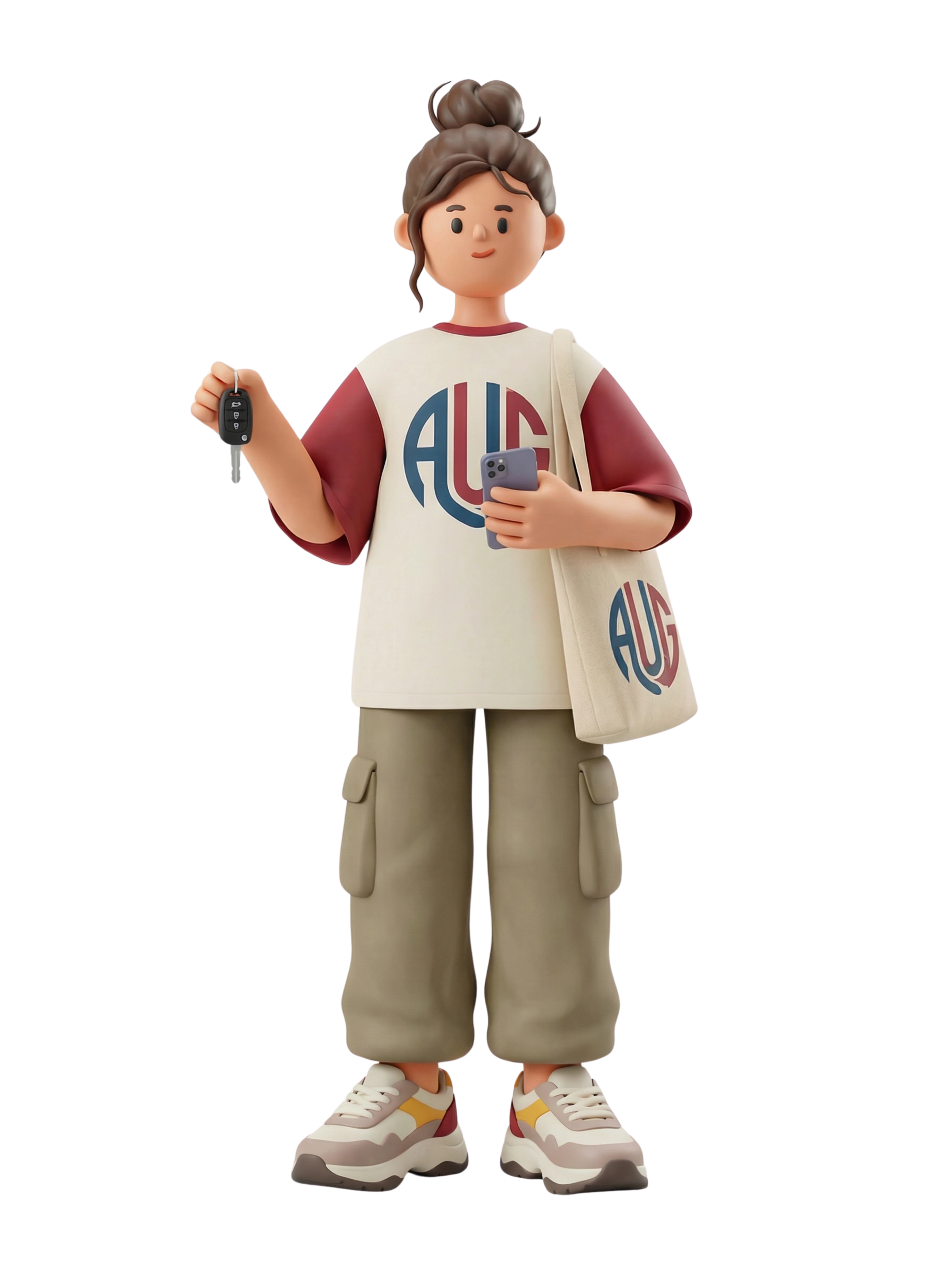 A dynamic university student confidently balancing campus life, holding her smartphone and car keys while dressed in casual urban wear that reflects a modern academic lifestyle.