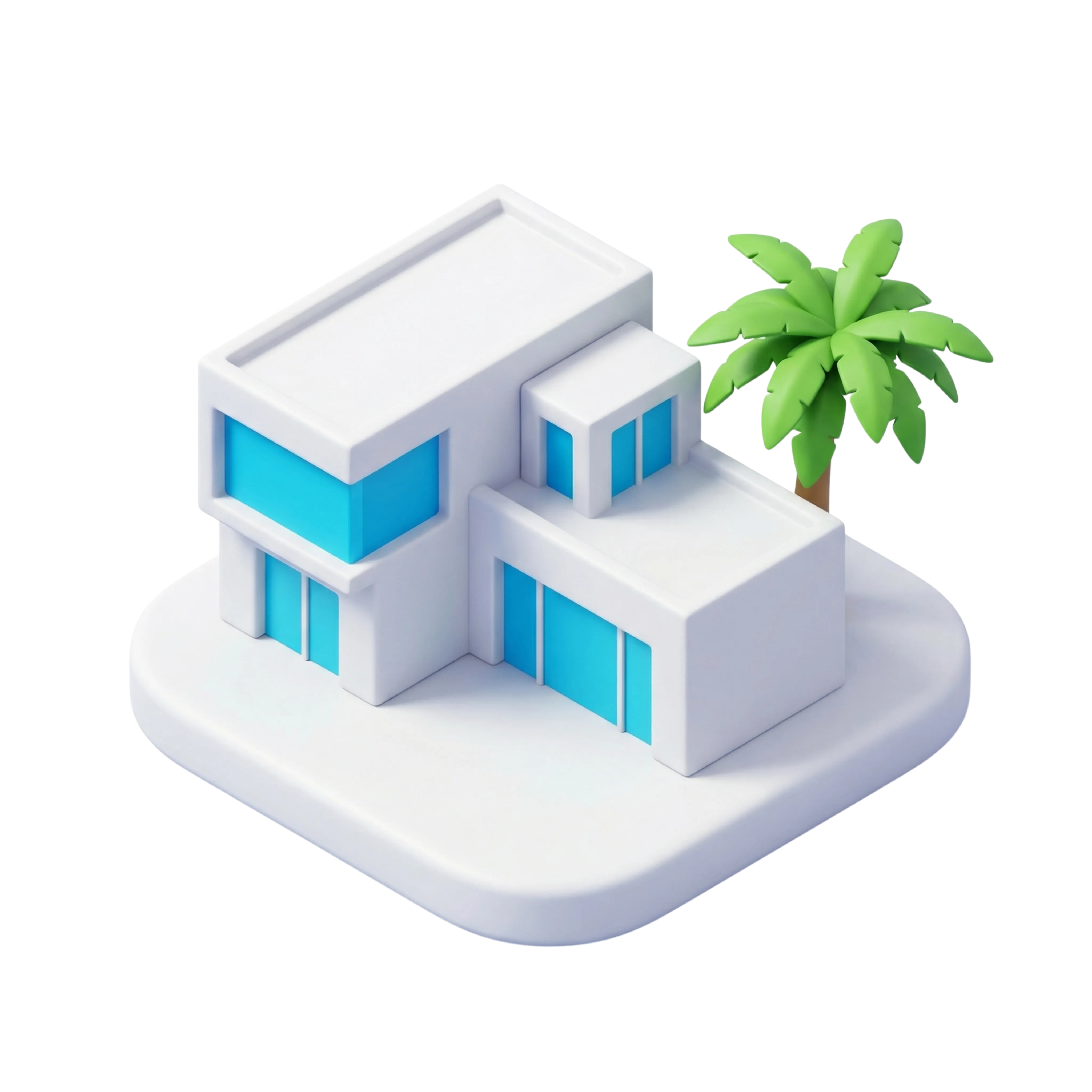 A high-quality 3D icon of a contemporary villa featuring a minimalist structure with matte white walls, sky blue glass windows, and a stylized palm tree, ideal for apps, maps, UX/UI design, or architectural mockups.