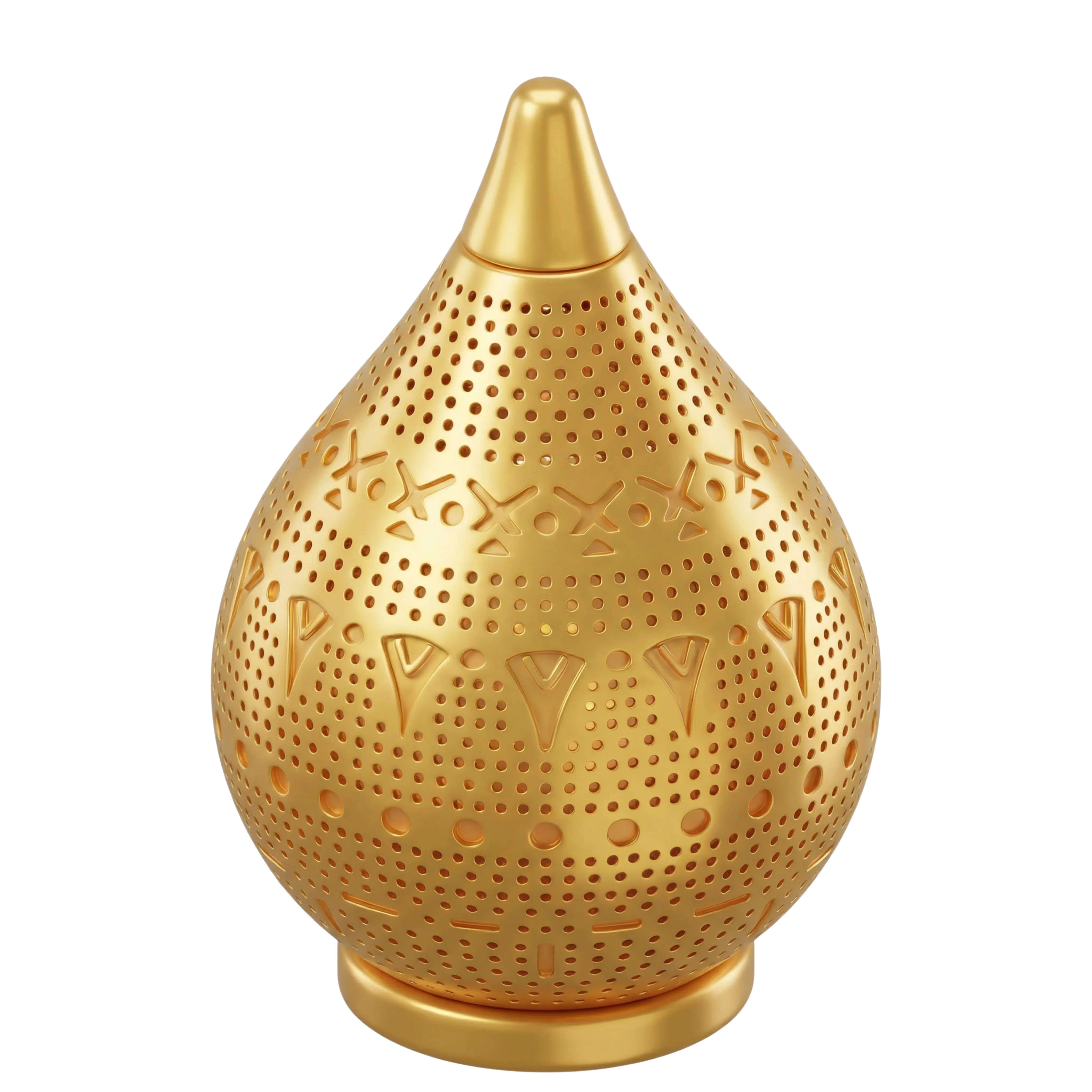 A detailed 3D model of a Moroccan-style floor lamp crafted in polished brass with engraved and perforated surface designs. This lamp design emits soft, ambient light through its decorative cutouts and is ideal for use in interior visualization, traditional home decor concepts, or cultural design themes.