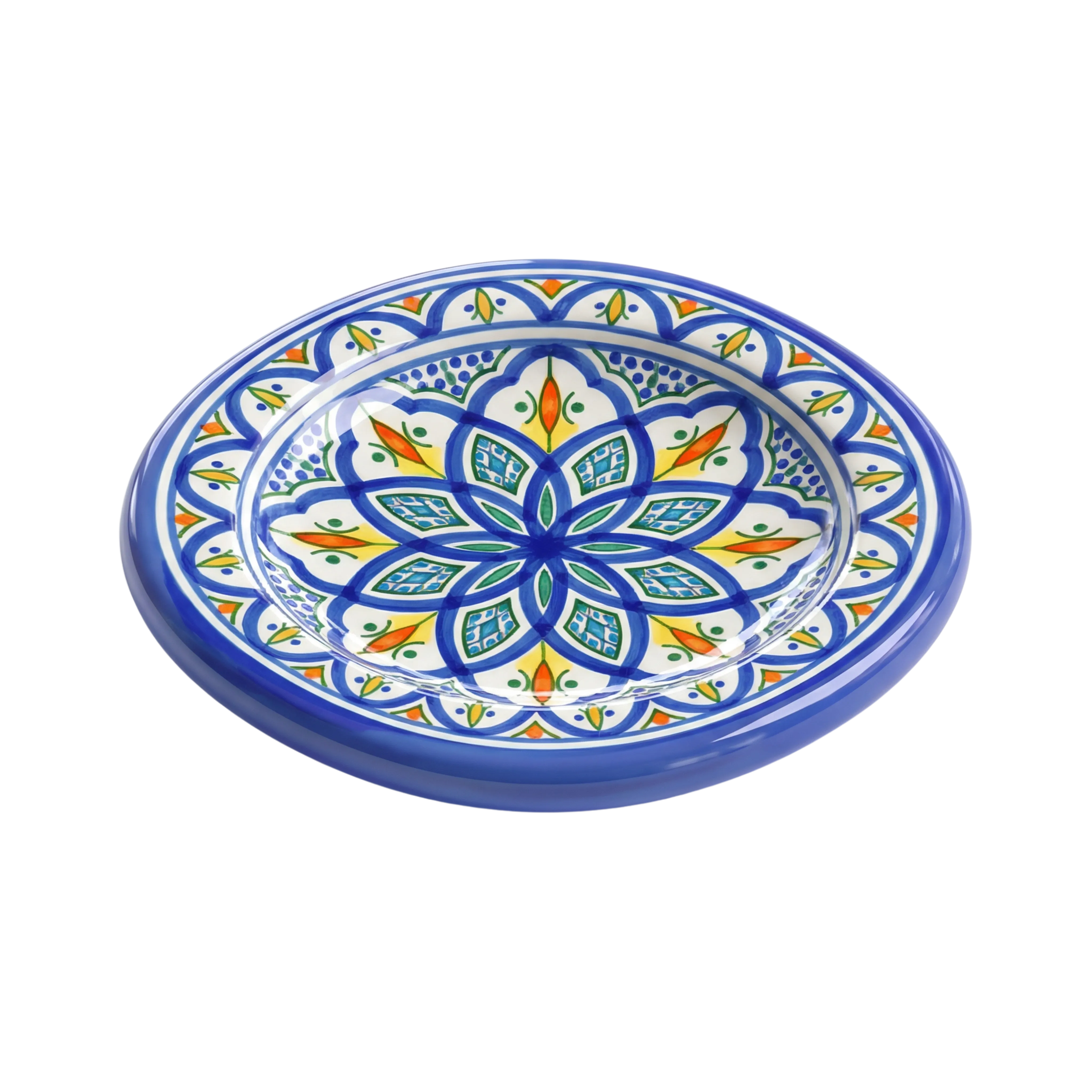 A high-quality 3D render of a traditional Moroccan Safi-style ceramic plate featuring intricate floral and geometric patterns in vibrant blue, green, and orange tones. The plate has a glossy glazed finish and is ideal for use in cultural visualizations, product mockups, or interior design scenes that draw on North African aesthetics.
