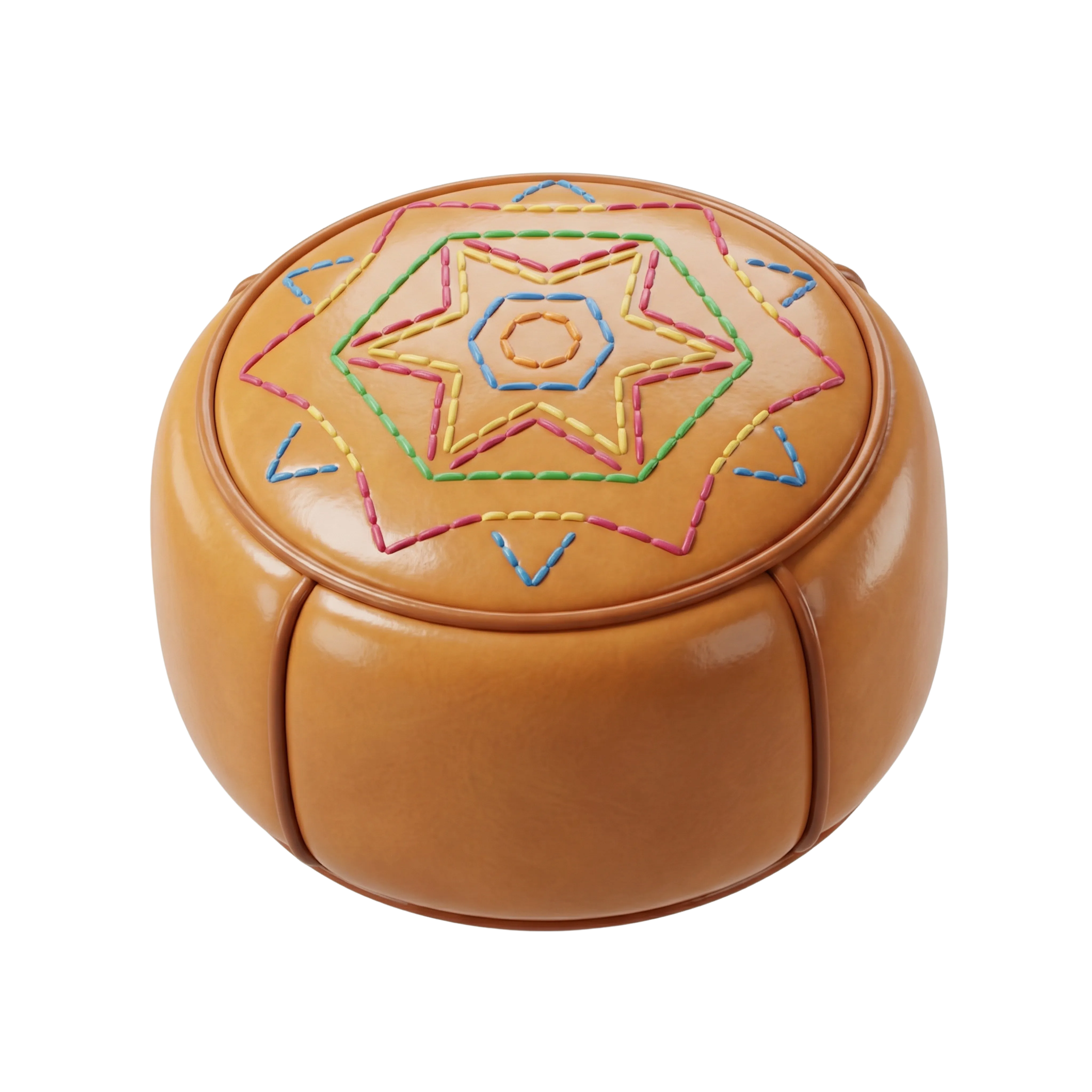 A realistic 3D render of a traditional Moroccan leather pouf featuring a matte finish and vibrant geometric embroidery on the top. Ideal for use in interior design visualizations, cultural projects, or furniture mockups that reflect North African heritage.