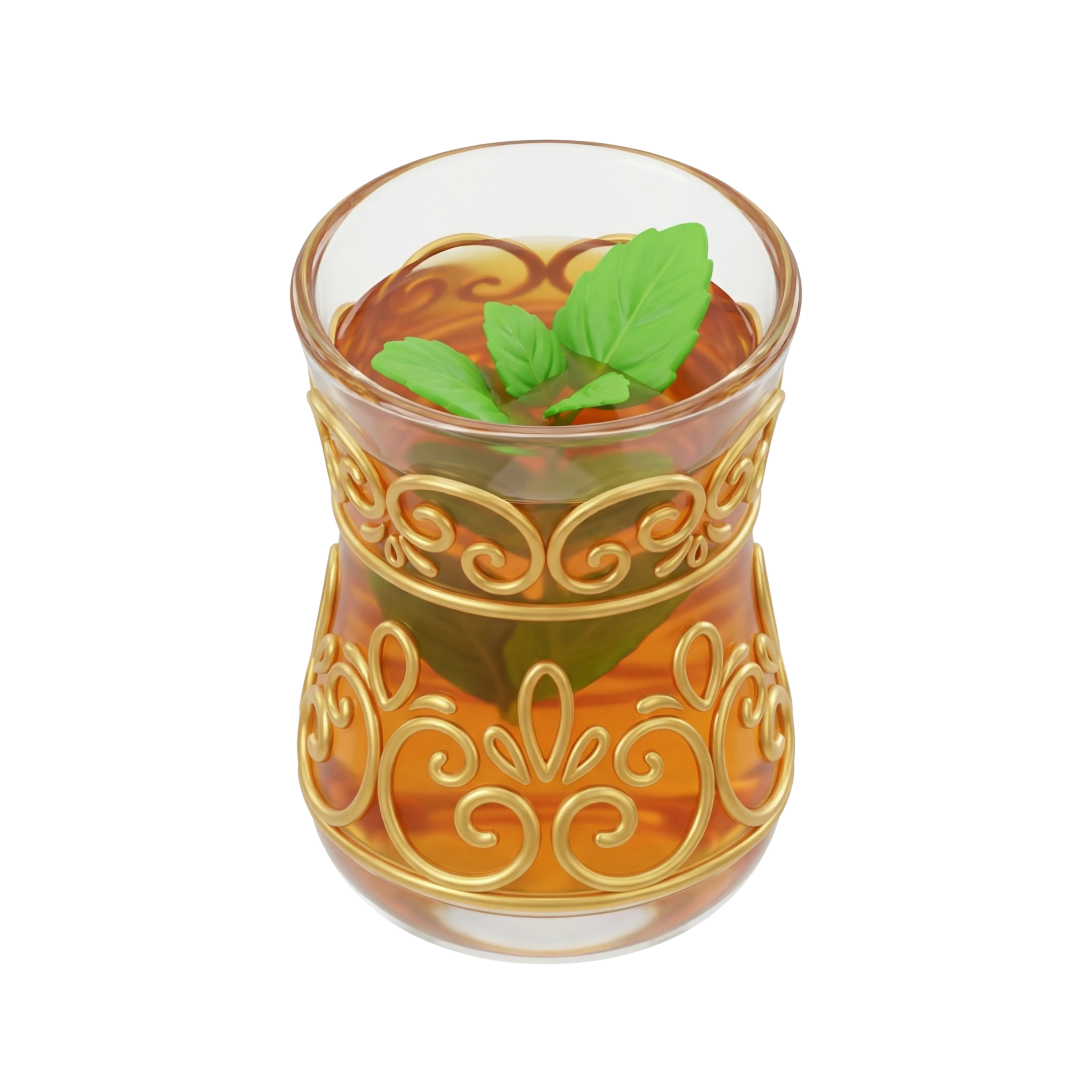 A high-quality 3D render of a traditional Moroccan tea glass featuring intricate golden metalwork and filled with mint-infused amber tea. Ideal for cultural, hospitality, or culinary-themed design projects.