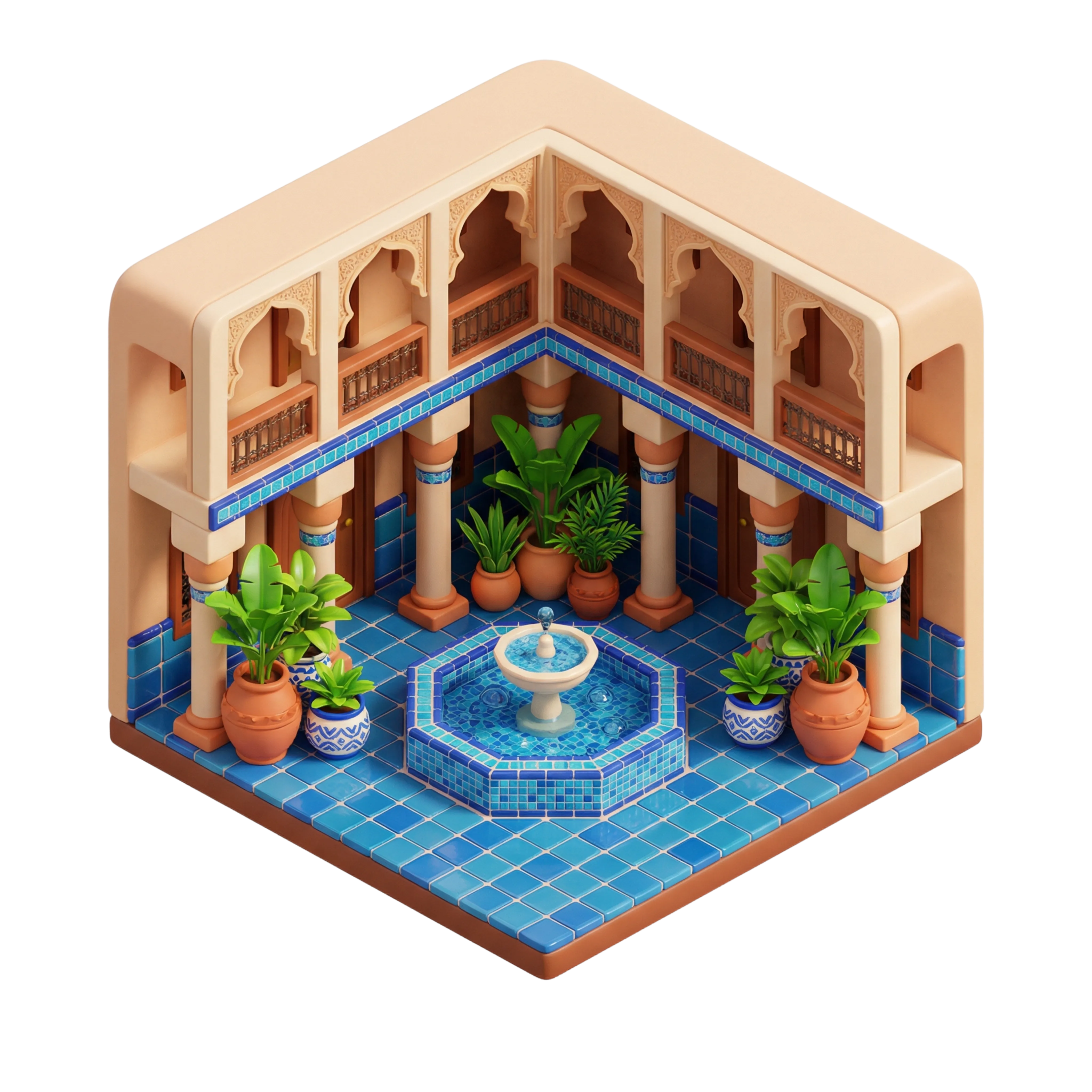 A detailed 3D model of a traditional Moroccan riad courtyard featuring glossy ceramic tiles, a central mosaic fountain, lush potted plants, and intricately carved arches. Ideal for architectural visualization, cultural scenes, and historical content in 3D environments.