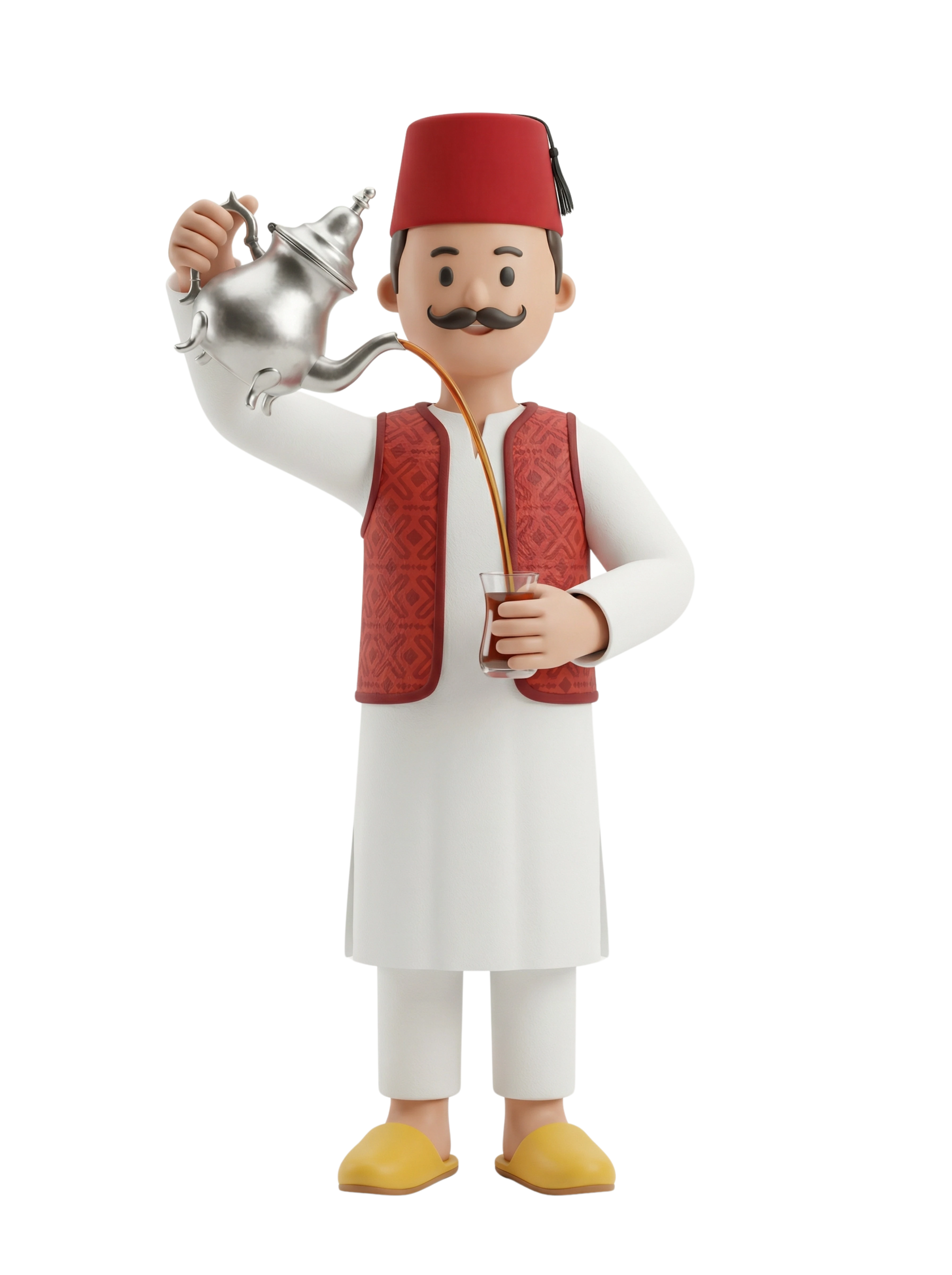A charismatic tea master performs the ceremonial art of Moroccan tea pouring, showcasing hospitality through elegant movement and traditional dress.