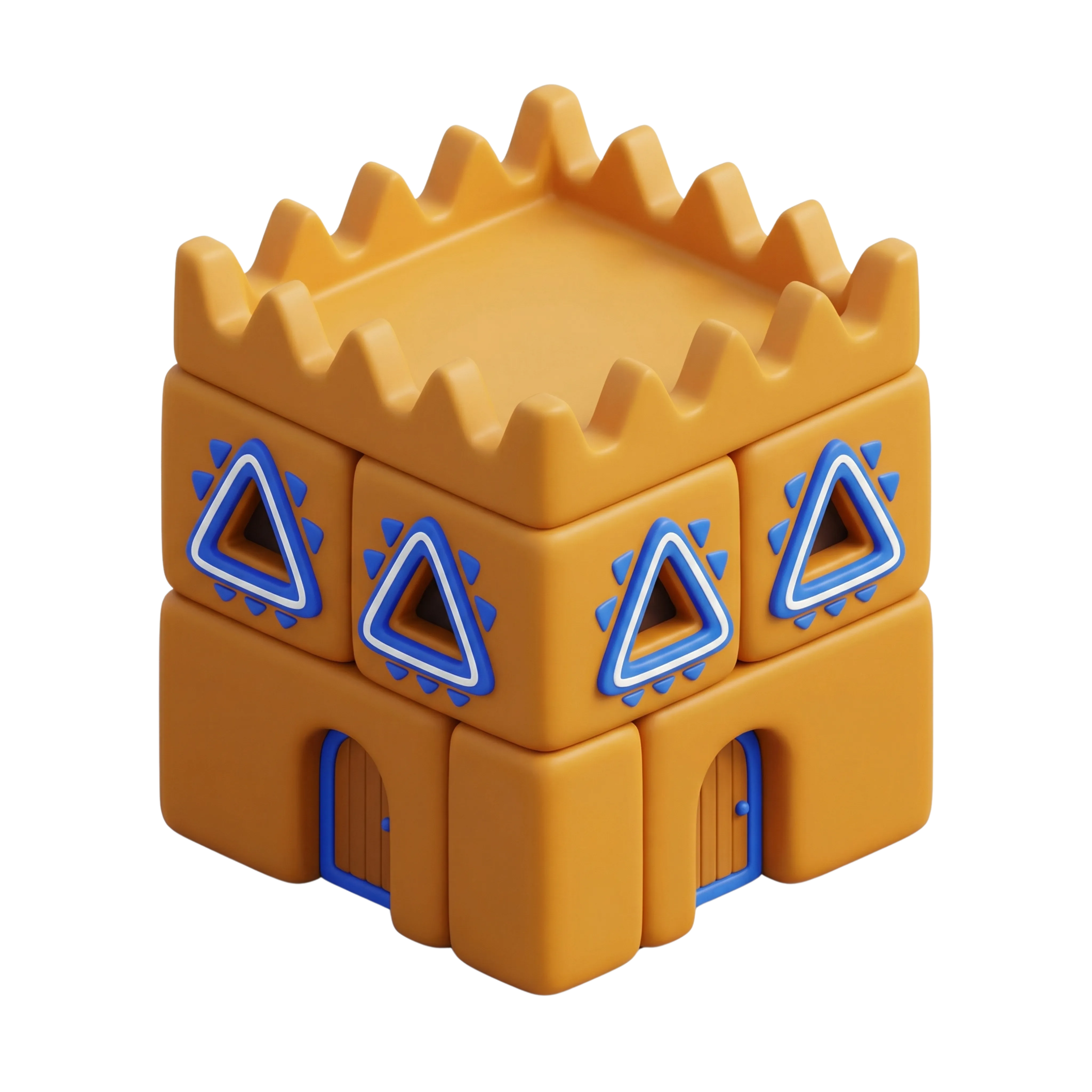 مجسم ثلاثي الأبعاد أنيق لمنزل طيني تقليدي على الطراز النجدي، بسطح غير لامع وزخارف نوافذ هندسية ملونة. يتميز التصميم بالنوافذ المثلثة والسقف المتوج الشهير بالعمارة النجدية في وسط السعودية. مناسب للتصاميم التراثية والمشاريع التعليمية والعروض التوضيحية الثقافية.