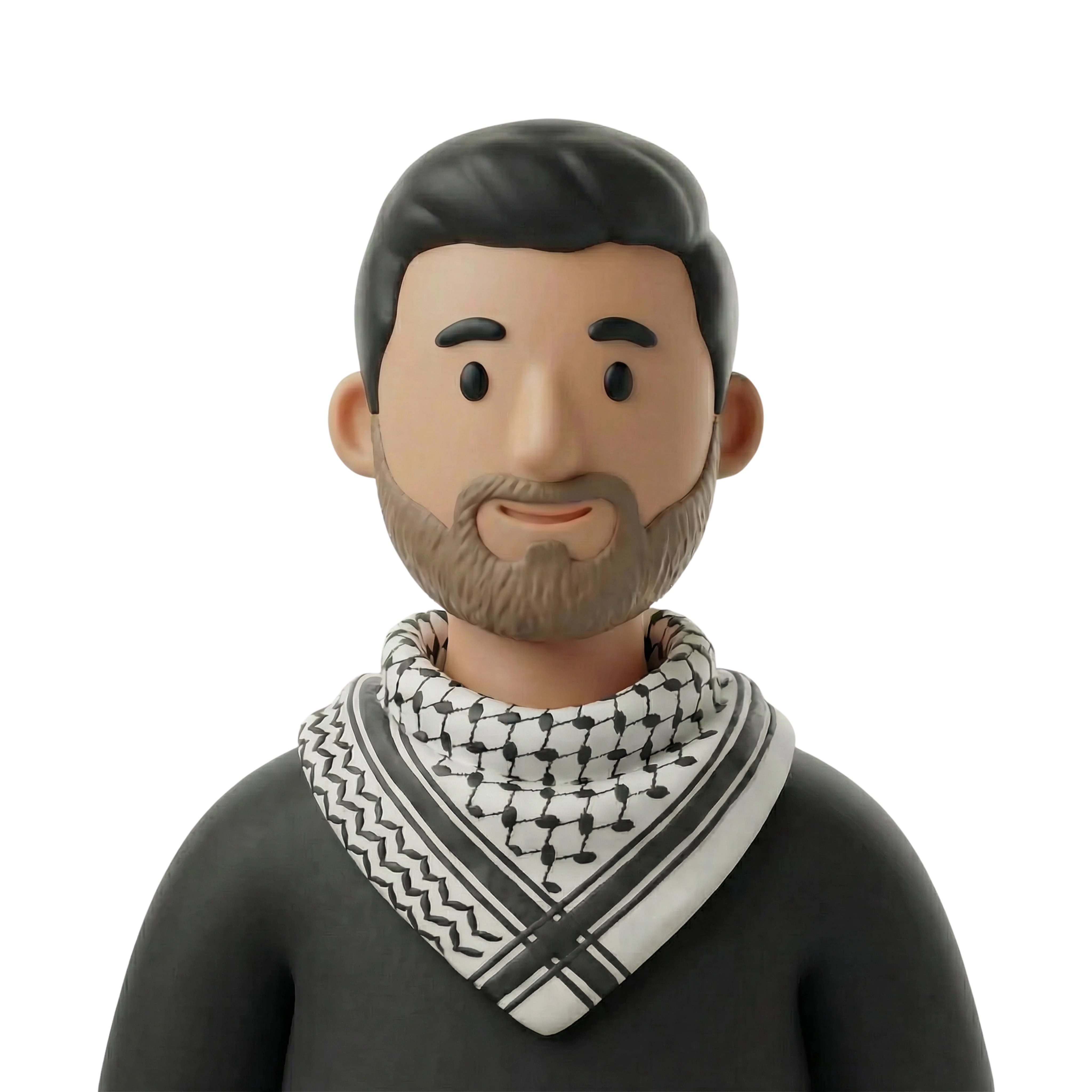 شخصية فلسطينية فخورة ترتدي الكوفية الرمزية، تعكس الصمود والهوية الوطنية في الثقافة الشرق أوسطية.