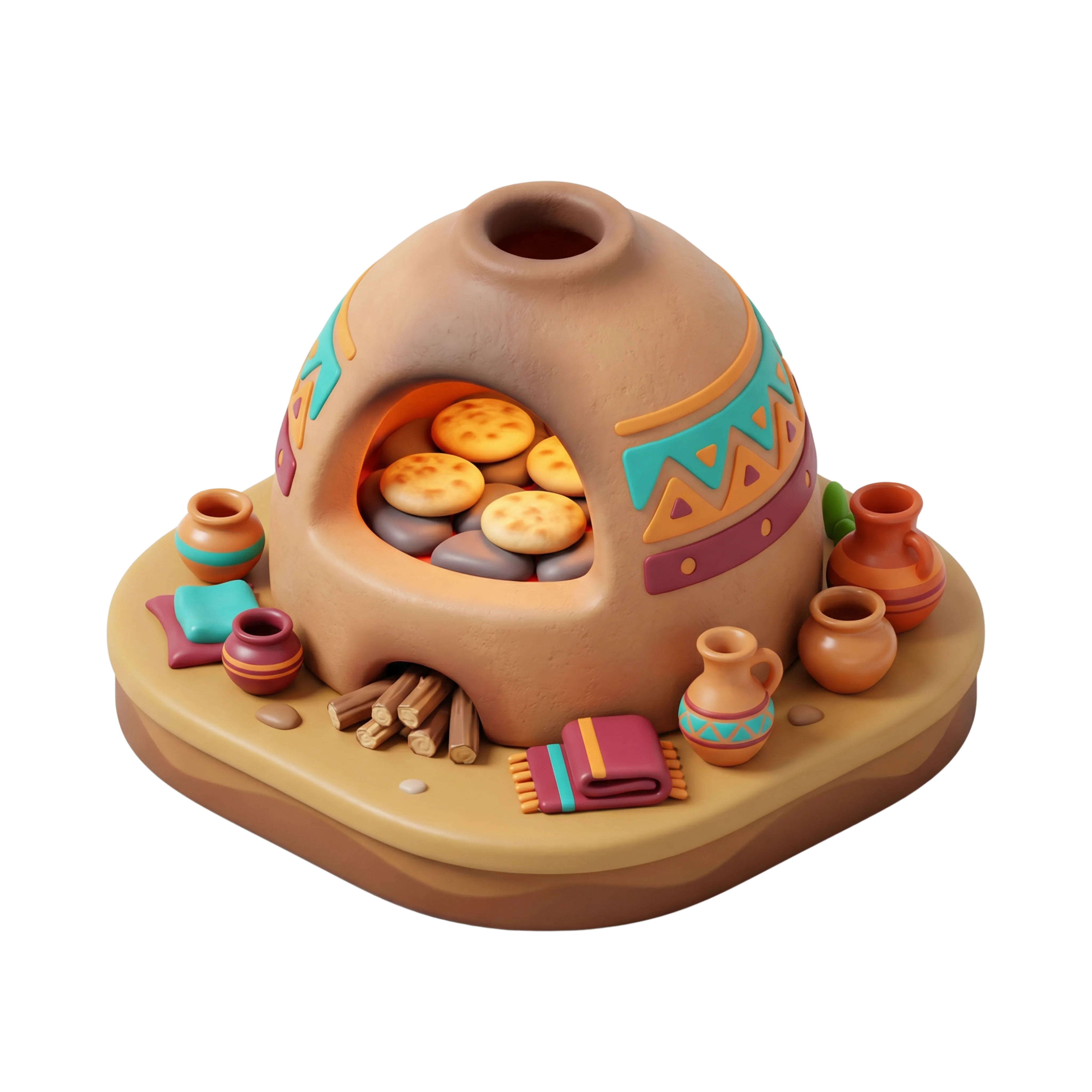 مجسم ثلاثي الأبعاد عالي الجودة لفرن الطابون الفلسطيني التقليدي مصنوع من خامة تشبه الفخار غير اللامع، مزين بزخارف هندسية ملونة. محاط بأوانٍ فخارية وقطع قماش وحطب، ويبرز أسلوب الخَبز التقليدي للخبز المسطّح، مما يجعله مثالياً للمحتوى البصري التراثي والثقافي.