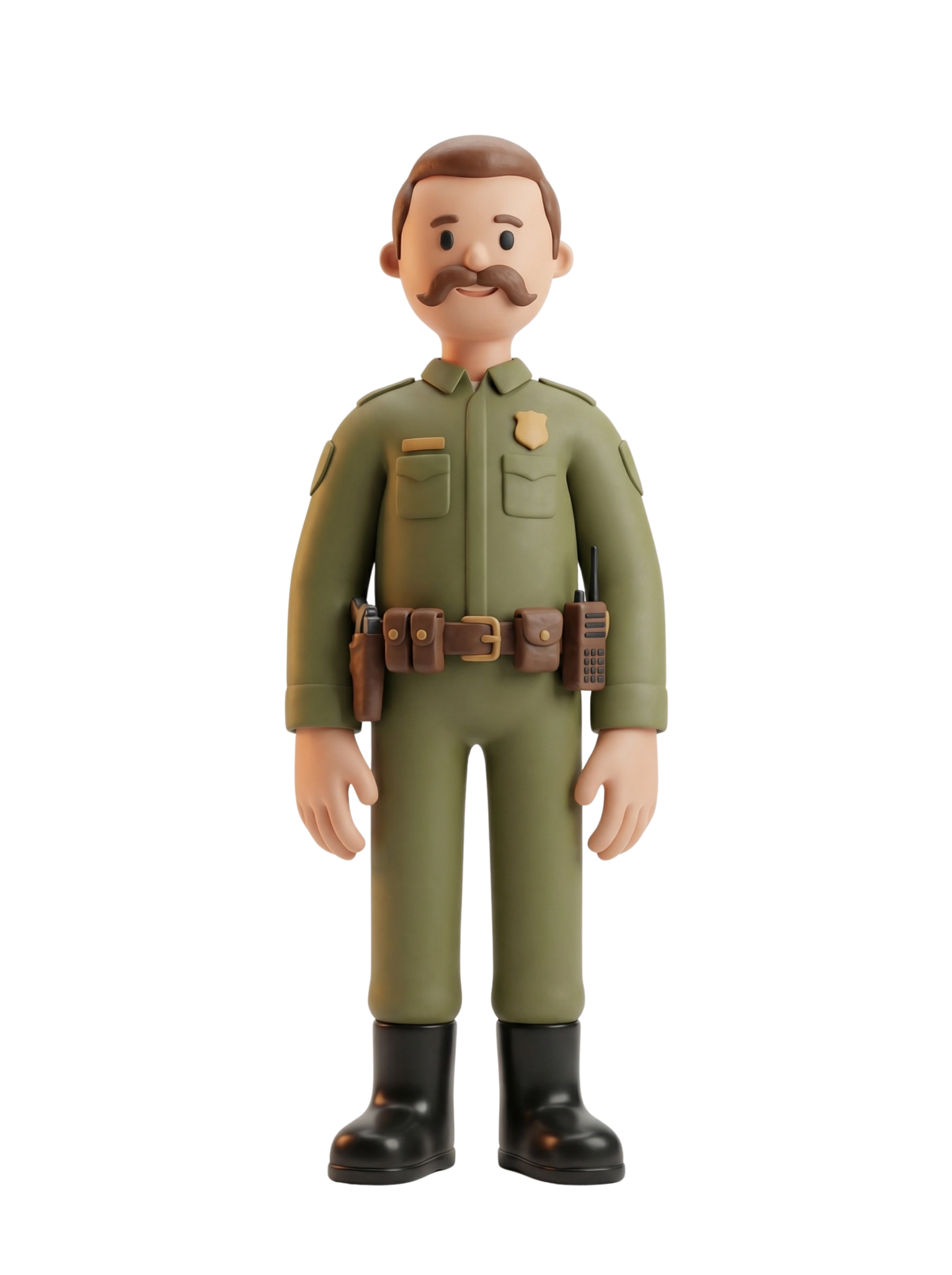 يقف ضابط الشرطة بزيه الأخضر المزود بشارة وحزام أدوات يحتوي على جهاز اتصال، معبراً عن الاحترافية والاستعداد في مجال تطبيق القانون.