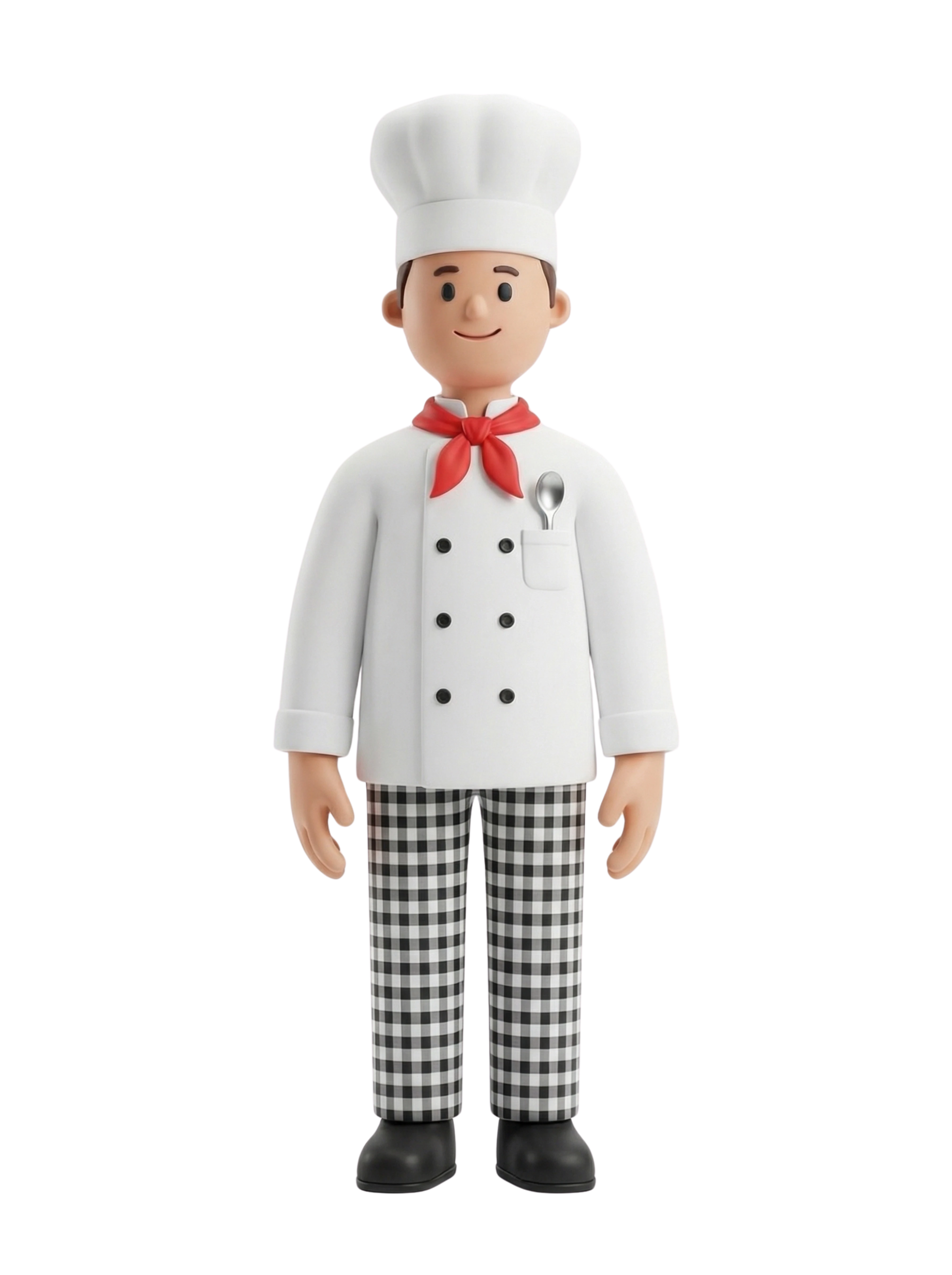 طاهٍ محترف ومبتهج مستعد للخدمة في المطبخ، يرتدي الزي التقليدي الأبيض مع وشاح أحمر وبنطال مربعات، يجسد المعايير العالمية لفن الطبخ.