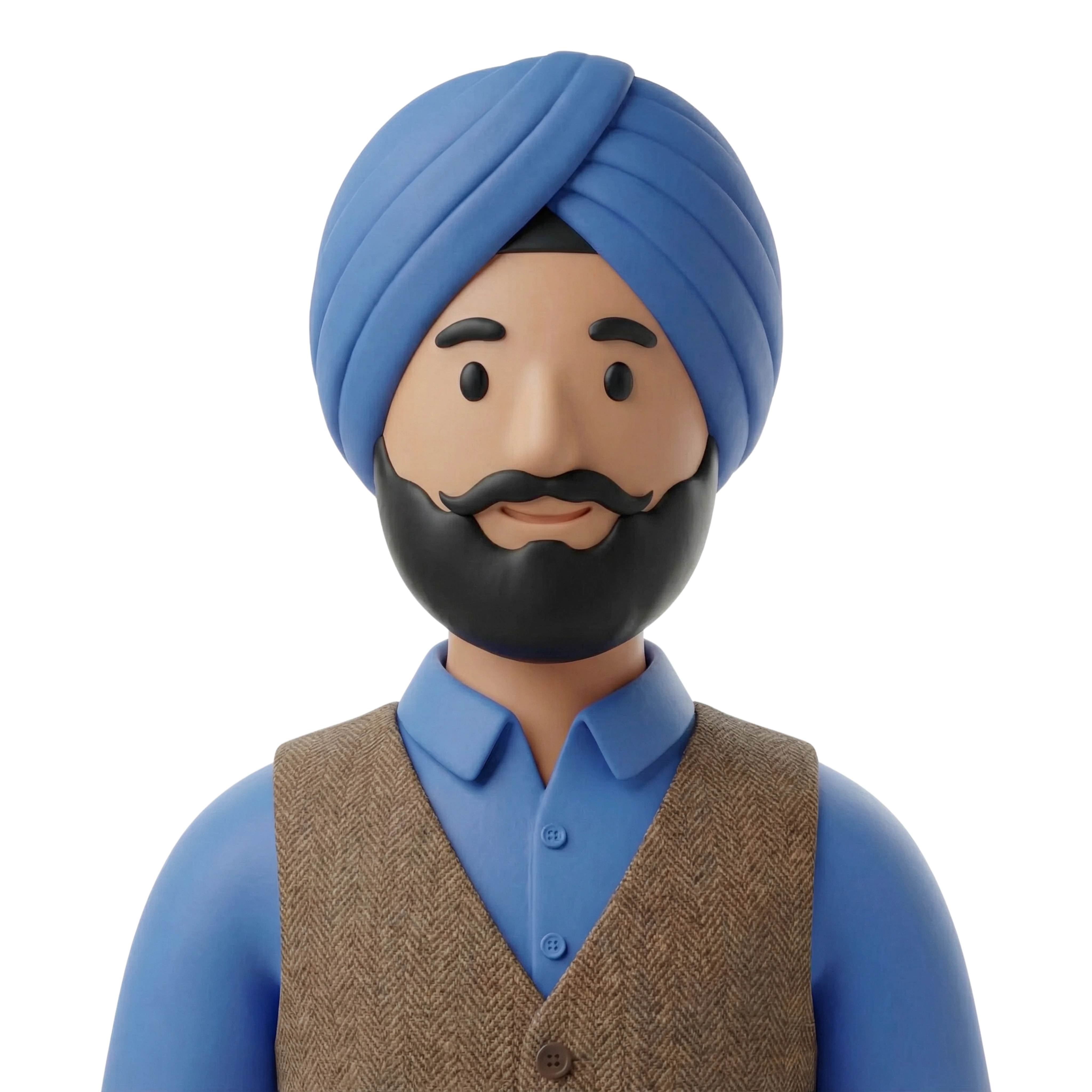رجل سيخي أنيق يرتدي عمامة زرقاء وقميصاً رسمياً مع سترة بنية، يجسد الاحترافية والهوية الثقافية في بيئة عصرية.