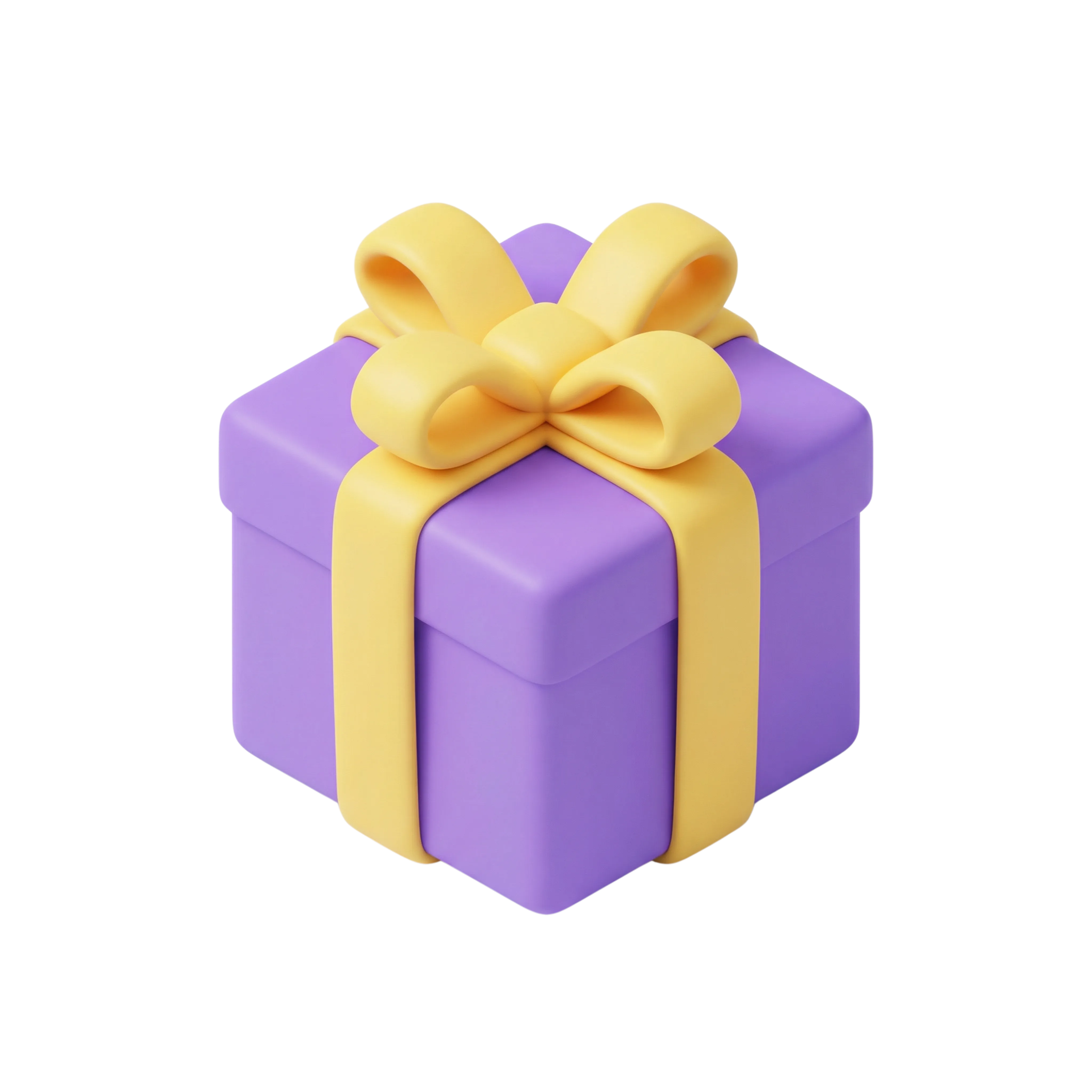 أيقونة ثلاثية الأبعاد عالية الجودة لصندوق هدية بنفسجي مربوط بشريط أصفر ناعم. يتميز المجسم بملمس بلاستيكي غير لامع، ويُعد مثاليًا لتصميم واجهات المستخدم، والرسومات الاحتفالية، والملصقات الرقمية أو محتوى العروض الترويجية المرتبطة بالهدايا والمناسبات.