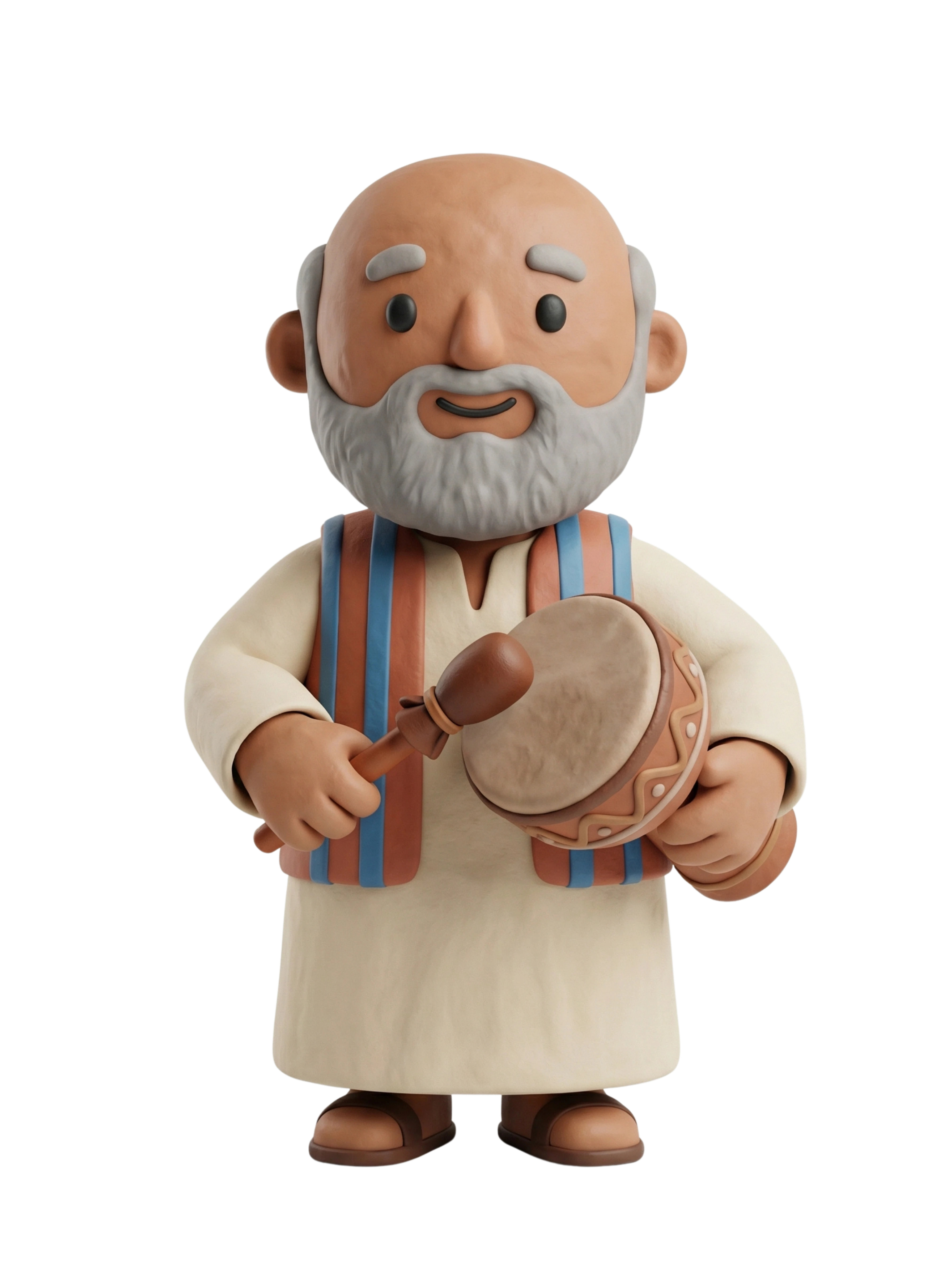 شخصية ثلاثية الأبعاد كاملة الطول لطبّال رمضاني مبتسم يرتدي ثوبًا كريميًا وسترة مخططة ويحمل طبلًا صغيرًا ومِطرقة خشبية، بلحية بيضاء وتعبير ودّي يعكس تقاليد المسحراتي. مثالية لمشاريع الهوية الثقافية، تصميم الشخصيات، ومنشورات وسائل التواصل.