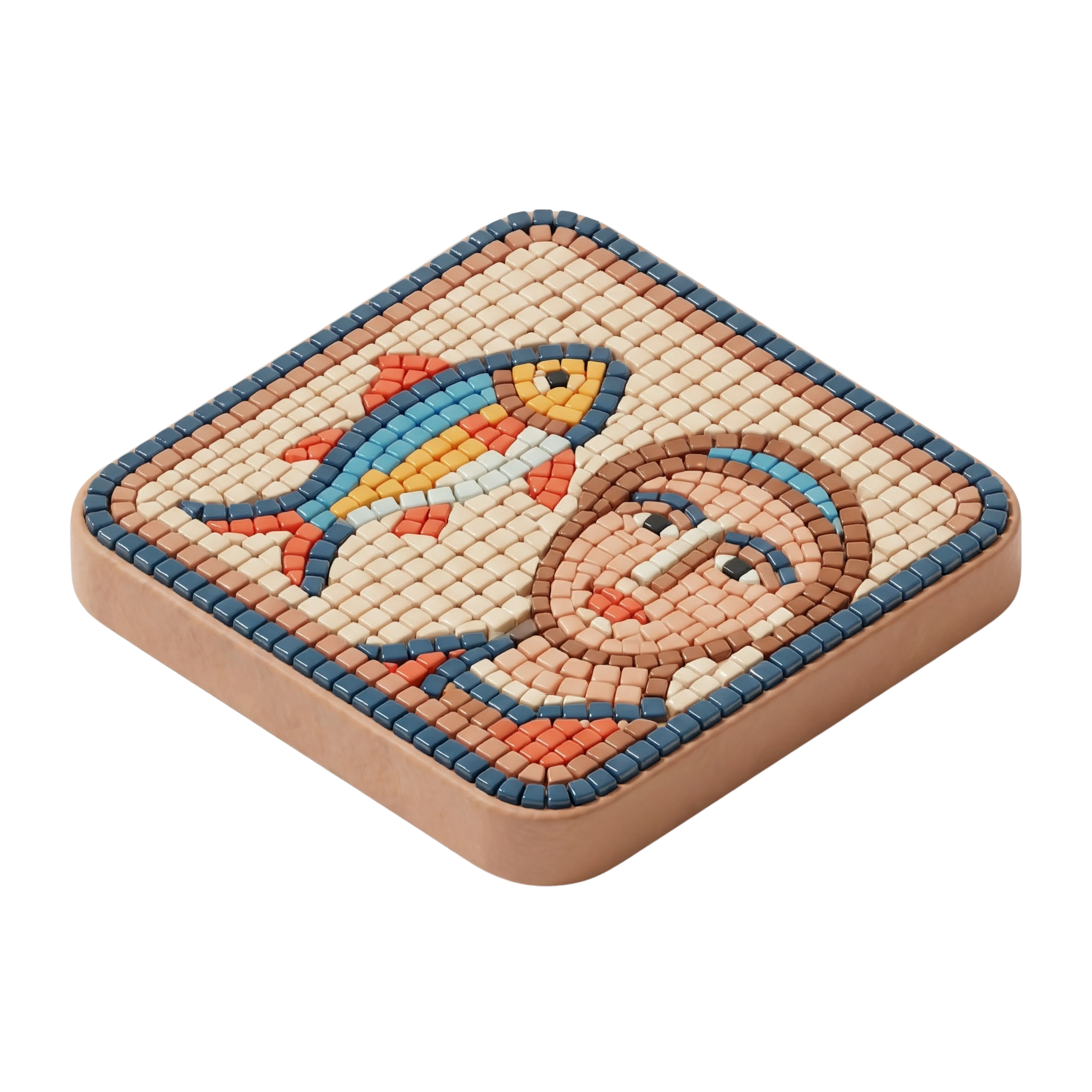 مجسم ثلاثي الأبعاد مفصل لبلاطة فسيفساء بأسلوب روماني، يظهر فيها وجه إنسان وزخرفة سمكة ملونة مصنوعة من قطع بلاط غير لامعة. مناسب للمشاريع التعليمية والعروض التاريخية والبيئات الرقمية ذات الطابع الكلاسيكي.
