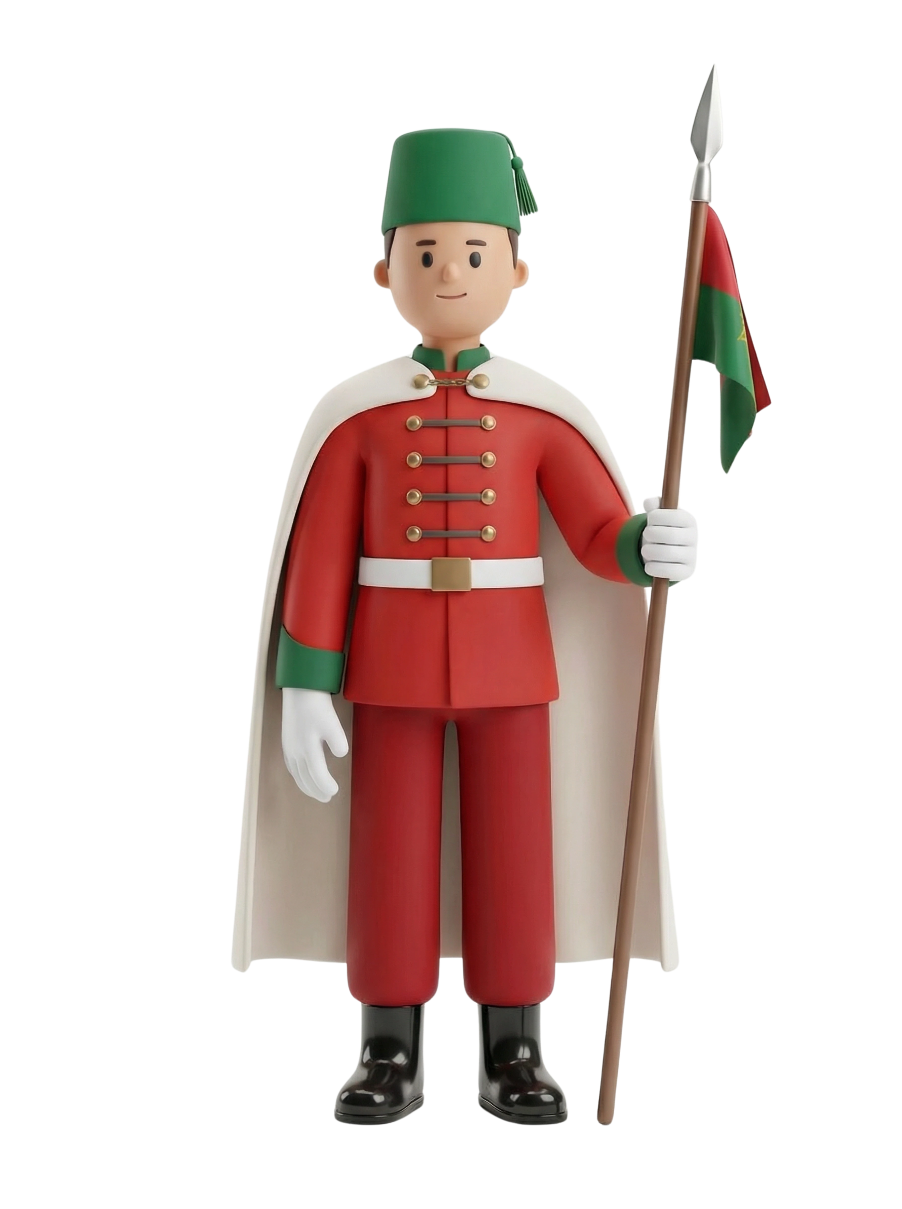 يقف الحارس الملكي بزي مغربي تقليدي احتفالي، معبرًا عن الفخر الوطني والإرث التاريخي من خلال زيه اللافت ووقفته المهيبة.