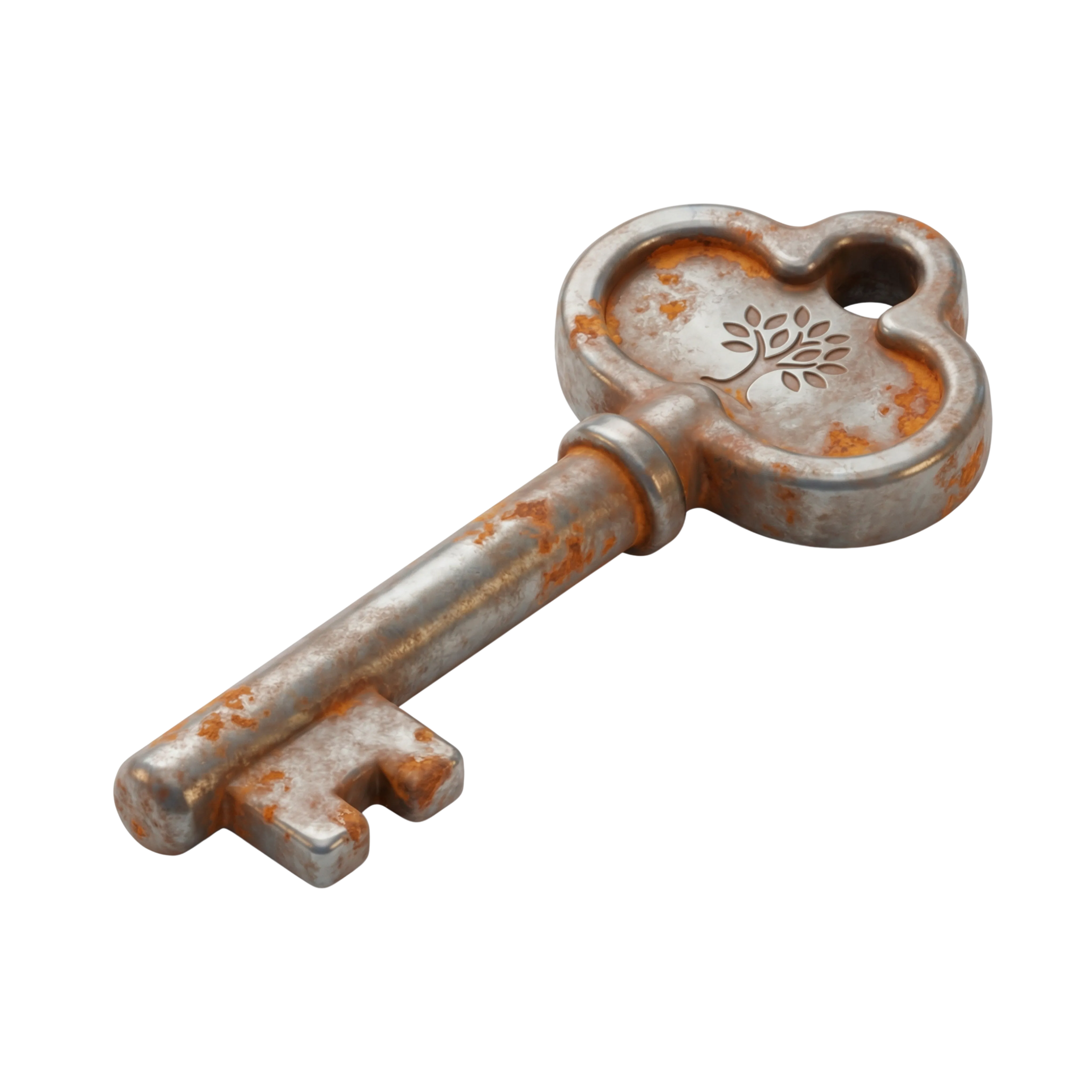 A detailed 3D render of an old iron key with a rustic, weathered metallic finish and intricate engraving of a tree symbol. Ideal for use in historical, fantasy, or vintage-themed 3D environments, games, or UI elements.