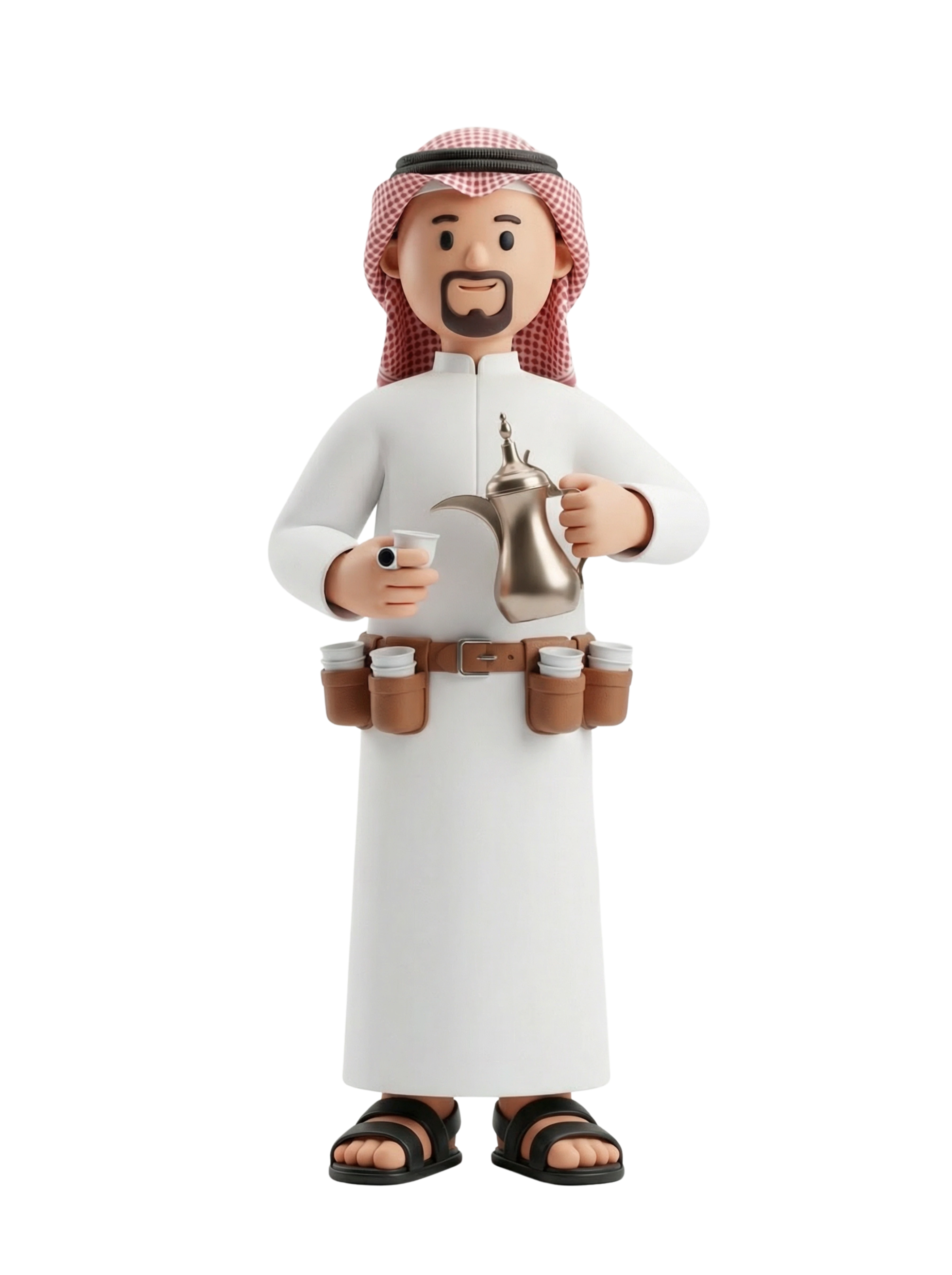 مضيف قهوة تقليدي يقدم القهوة العربية بأناقة ثقافية، يرتدي الثوب السعودي والغطرة، ومزود بحزام يحتوي على فناجين الضيافة.