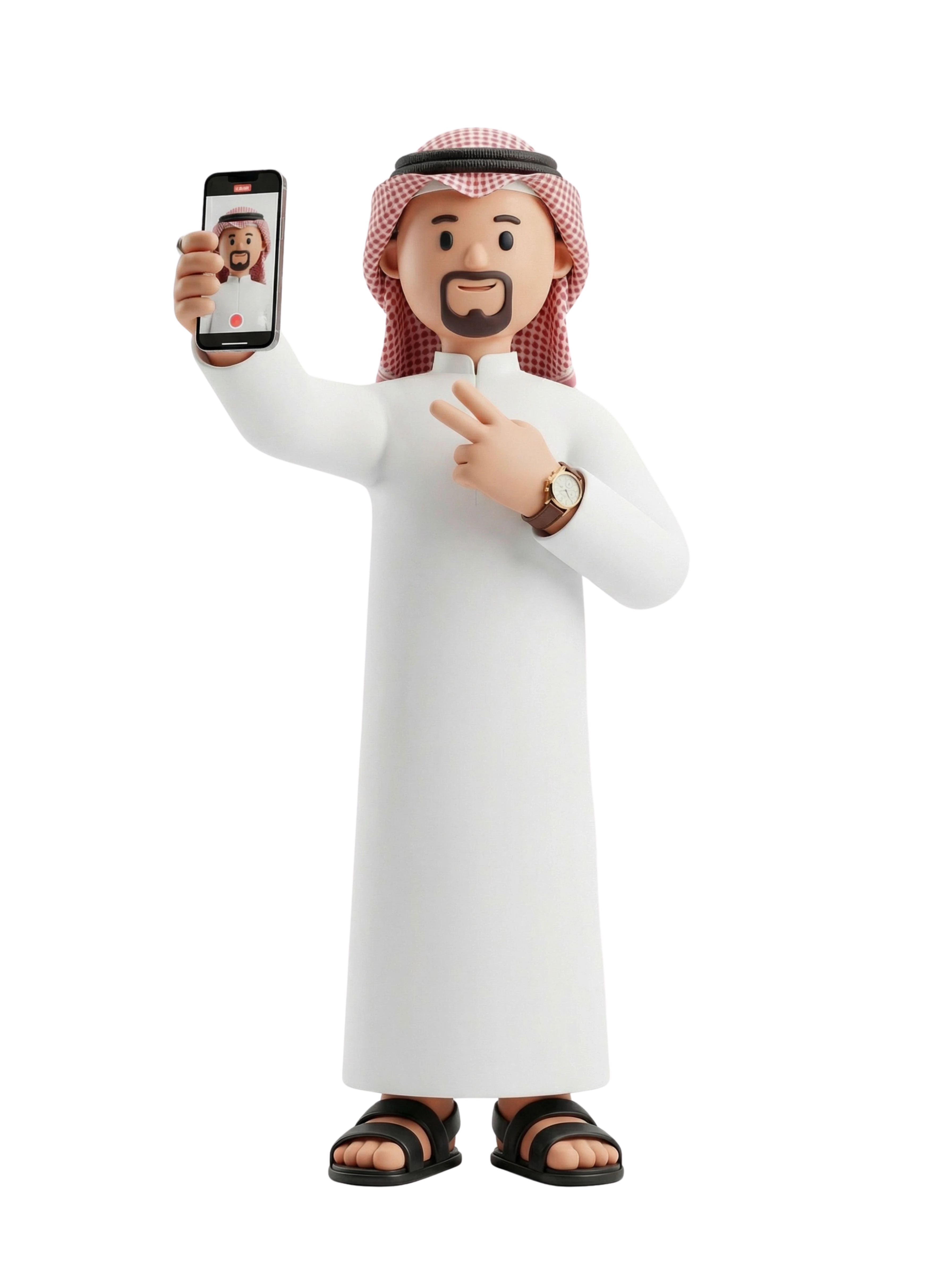 A charismatic social media influencer capturing a live video, dressed in traditional Saudi attire with a confident pose that reflects modern digital engagement and cultural pride.
