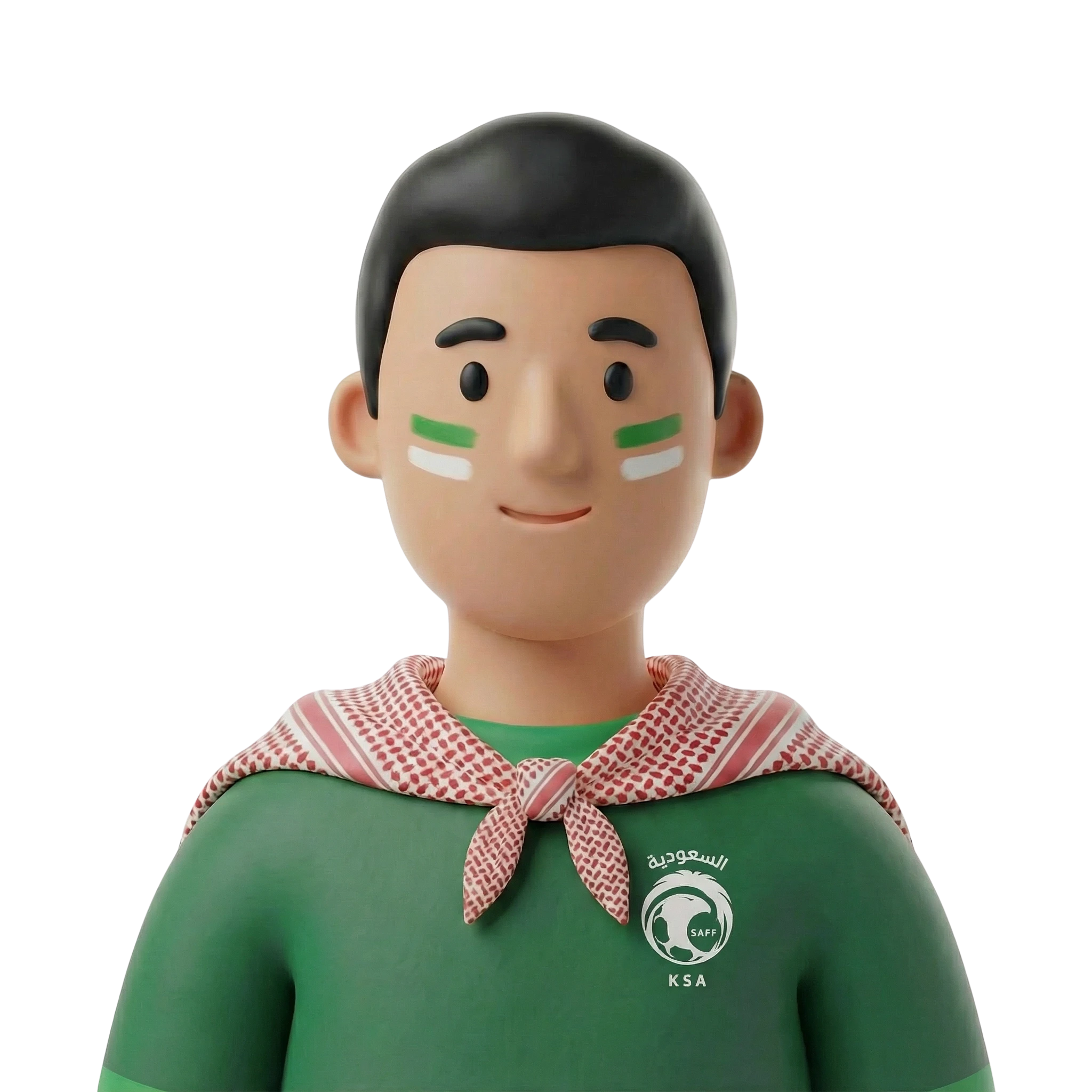 مشجع سعودي متحمس يعبر عن فخره الوطني، يرتدي قميص المنتخب الأخضر مع شعار الاتحاد السعودي ويلوّن وجهه بخطوط خضراء وبيضاء، مع شماغ ملفوف على الكتفين، مستعد لتشجيع فريقه في البطولات.