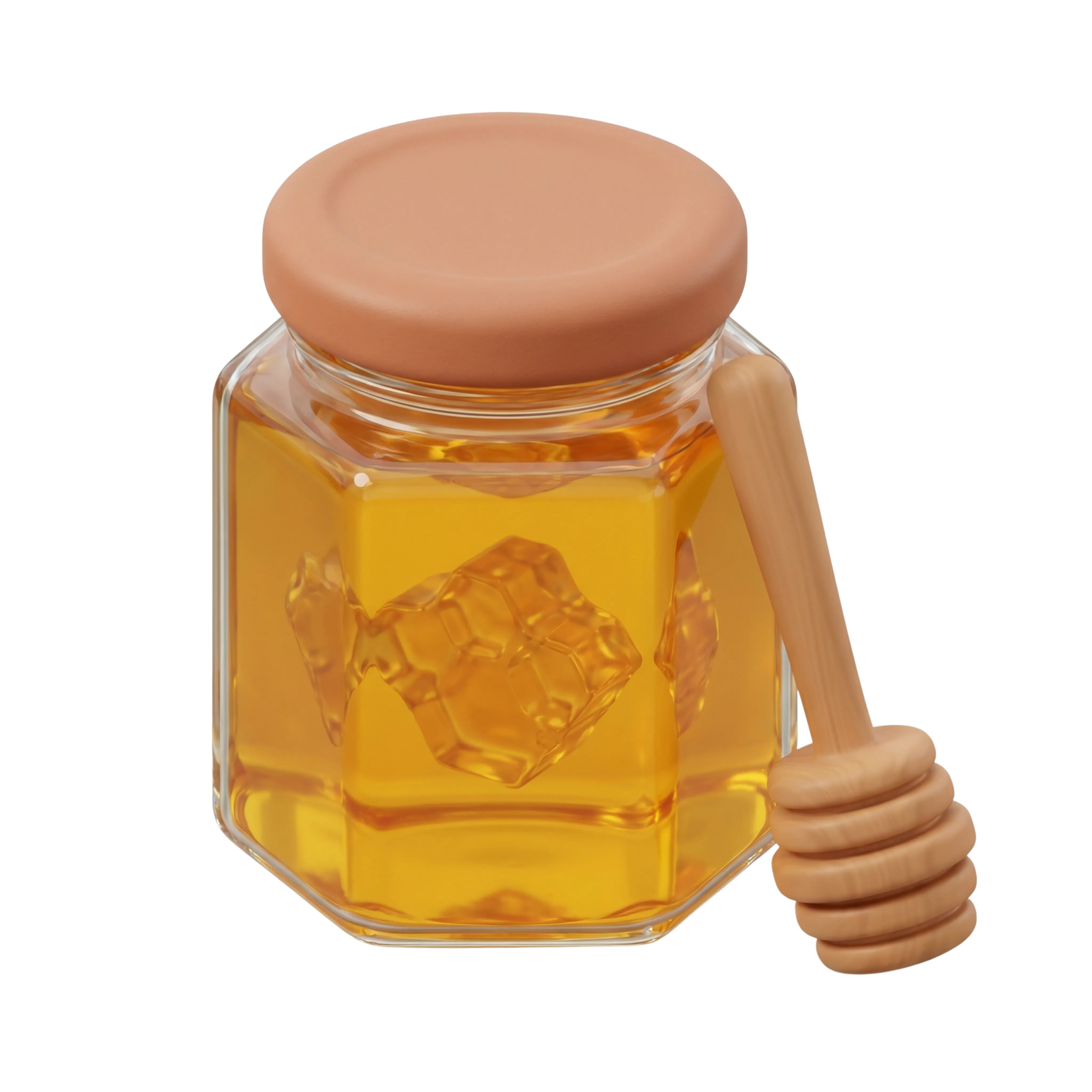 مجسم ثلاثي الأبعاد عالي الجودة لبرطمان عسل السدر مصنوع من الزجاج الشفاف ولونه ذهبي دافئ، مع غطاء غير لامع ومرفق بمغرفة خشبية. مناسب لتصاميم عبوات العسل، علامات الأغذية العضوية، أو مشاريع بصرية تتعلق بالتغذية الثقافية.