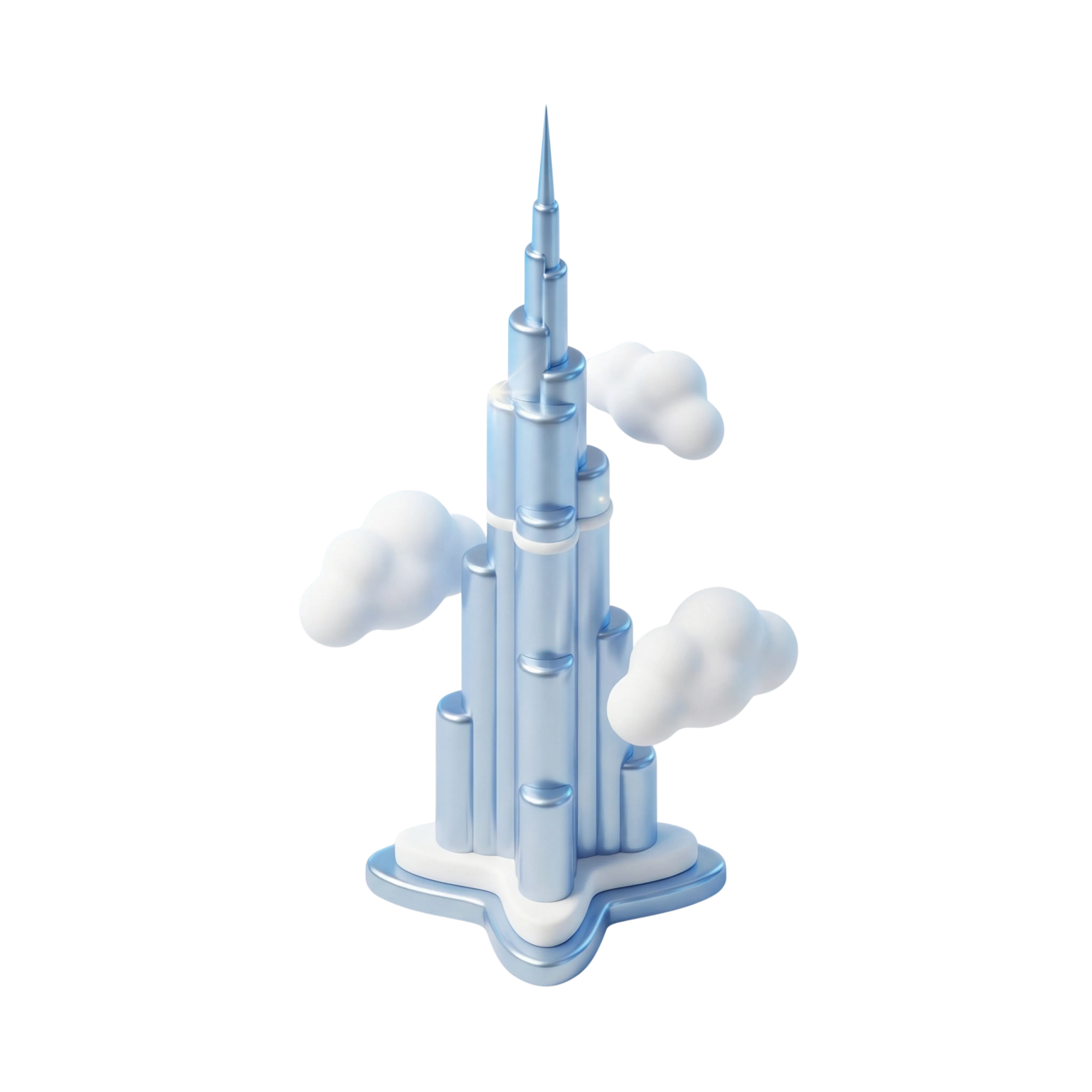 مجسم ثلاثي الأبعاد مبسط لبرج خليفة الشهير، بلمسة معدنية لامعة بدرجات الأزرق، محاط بسحب ناعمة لإبراز طابعه المعماري المميز. مناسب لتصاميم العلامات التجارية، أو مشاريع السفر والسياحة، أو السرد البصري الخاص بدولة الإمارات.