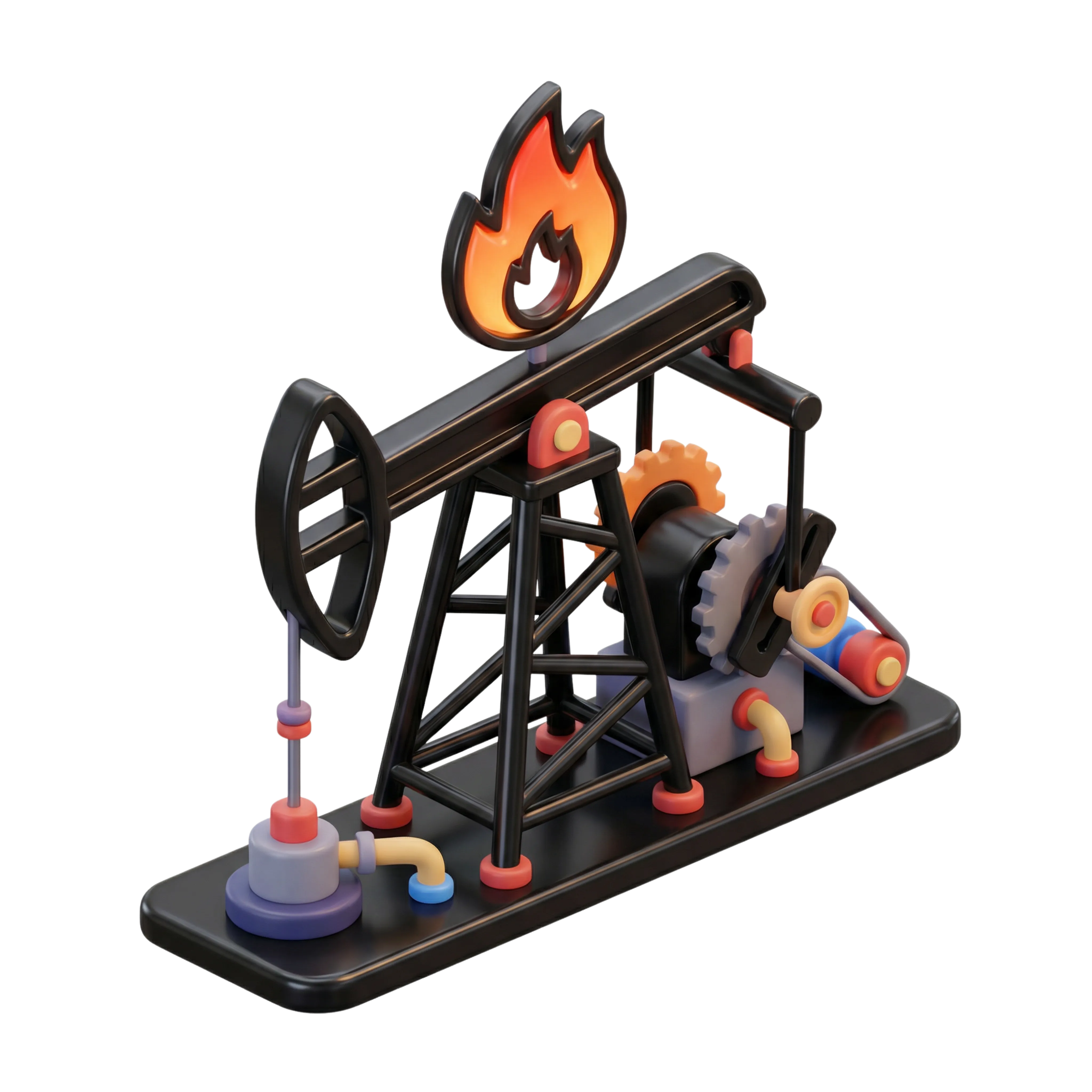 A stylized 3D model of an oil rig featuring matte black structural elements with semi-gloss colorful details, including gears, pipes, and a flame icon. Ideal for use in infographics, energy-related UI/UX designs, or educational animations themed around petroleum and industrial processes.