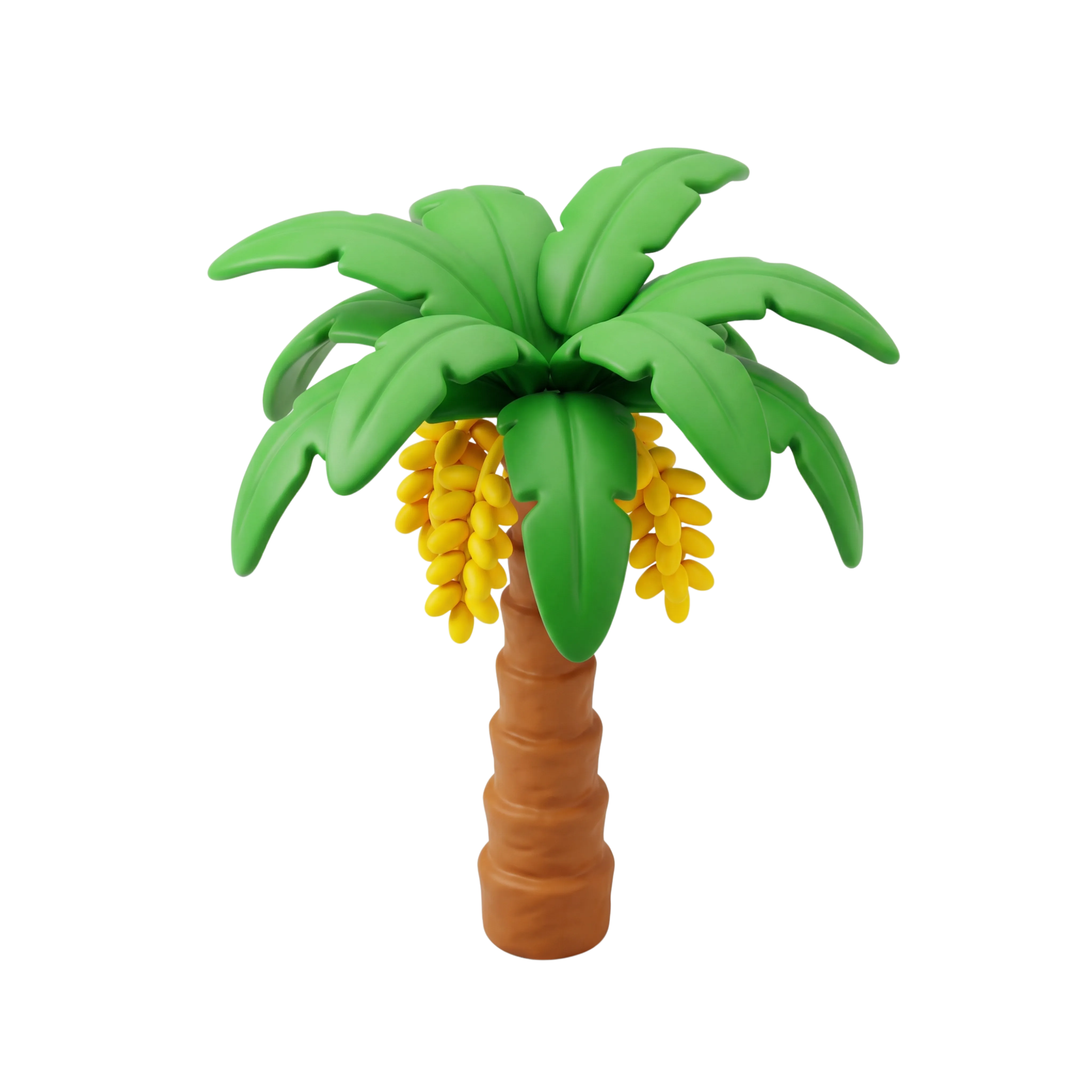 مجسم ثلاثي الأبعاد لنخلة مصممة بأسلوب كرتوني مع أوراق خضراء وعناقيد تمر صفراء بملمس غير لامع. مثالي للاستخدام في بيئات الألعاب أو الرسوم التعليمية أو أيقونات الواجهات ذات الطابع الاستوائي.