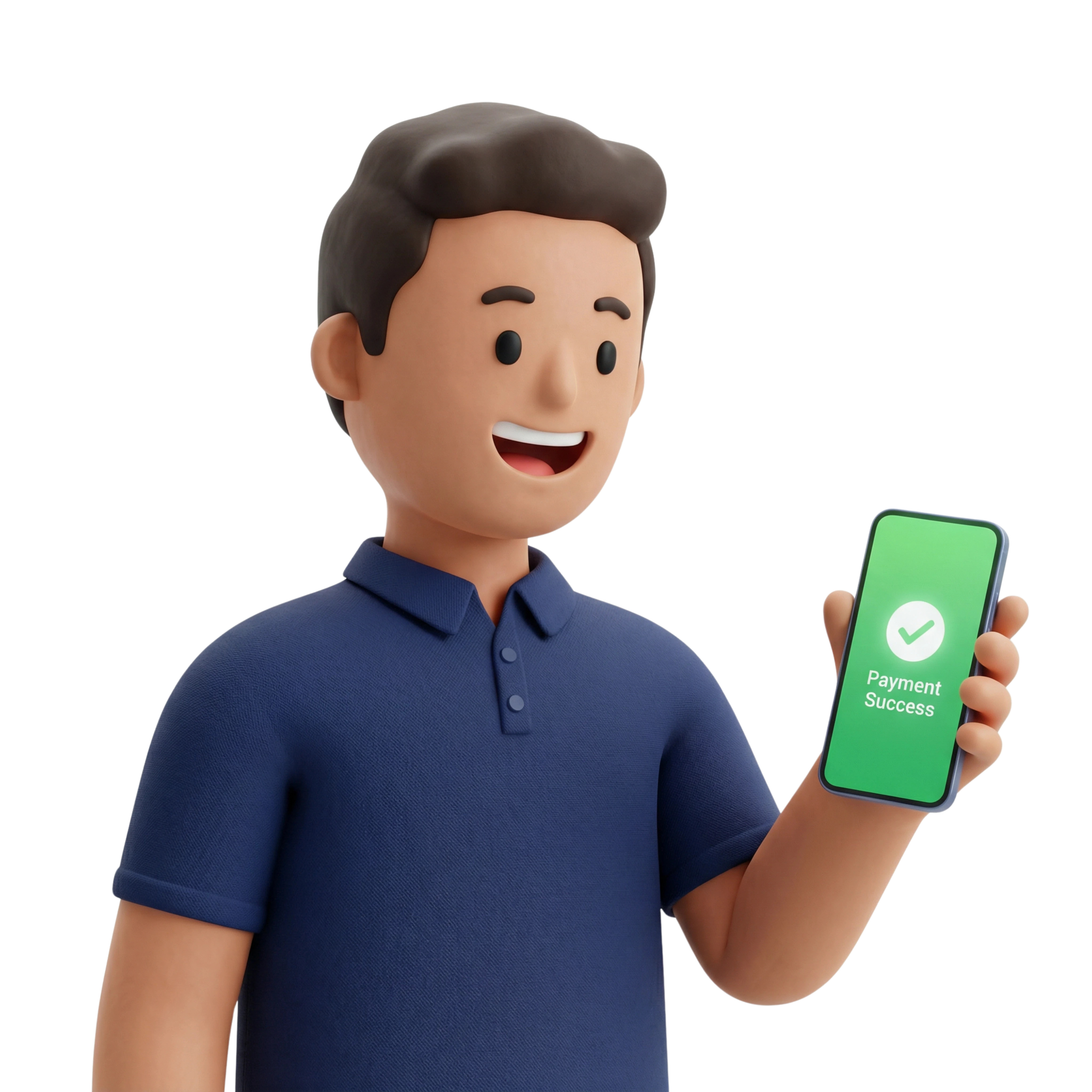 شخصية مبهجة ومتمرسة بالتقنية تمسك بهاتف ذكي يعرض رسالة 'تم الدفع بنجاح'، مما يعكس الثقة والراحة في المعاملات الرقمية.