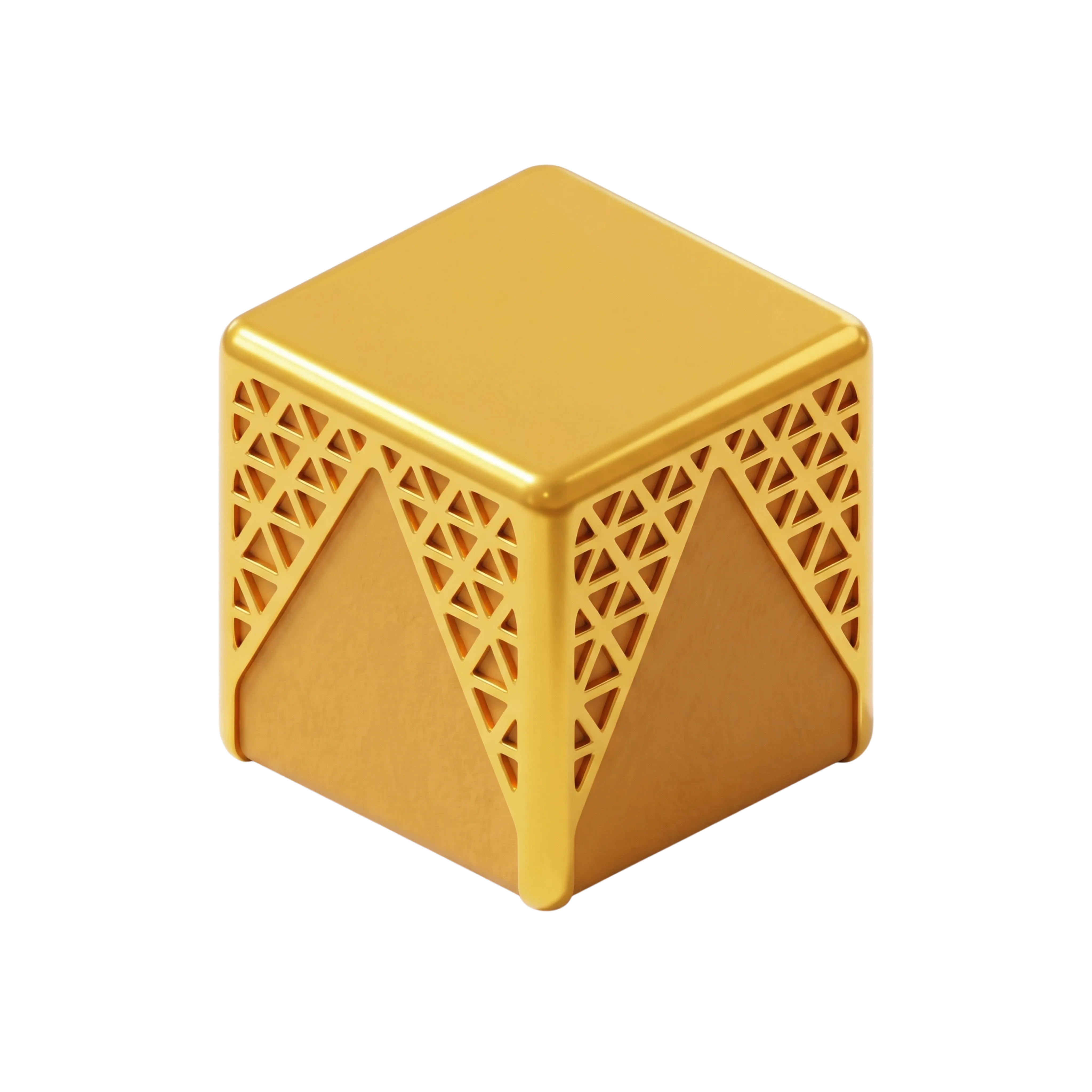 A high-quality 3D render of The Mukaab, an iconic cube-shaped architectural structure with a glossy gold metallic surface and triangular geometric detailing. Representative of Saudi Arabia’s futuristic urban vision, this asset is ideal for use in cultural infographics, branding materials, and Middle Eastern architectural presentations.