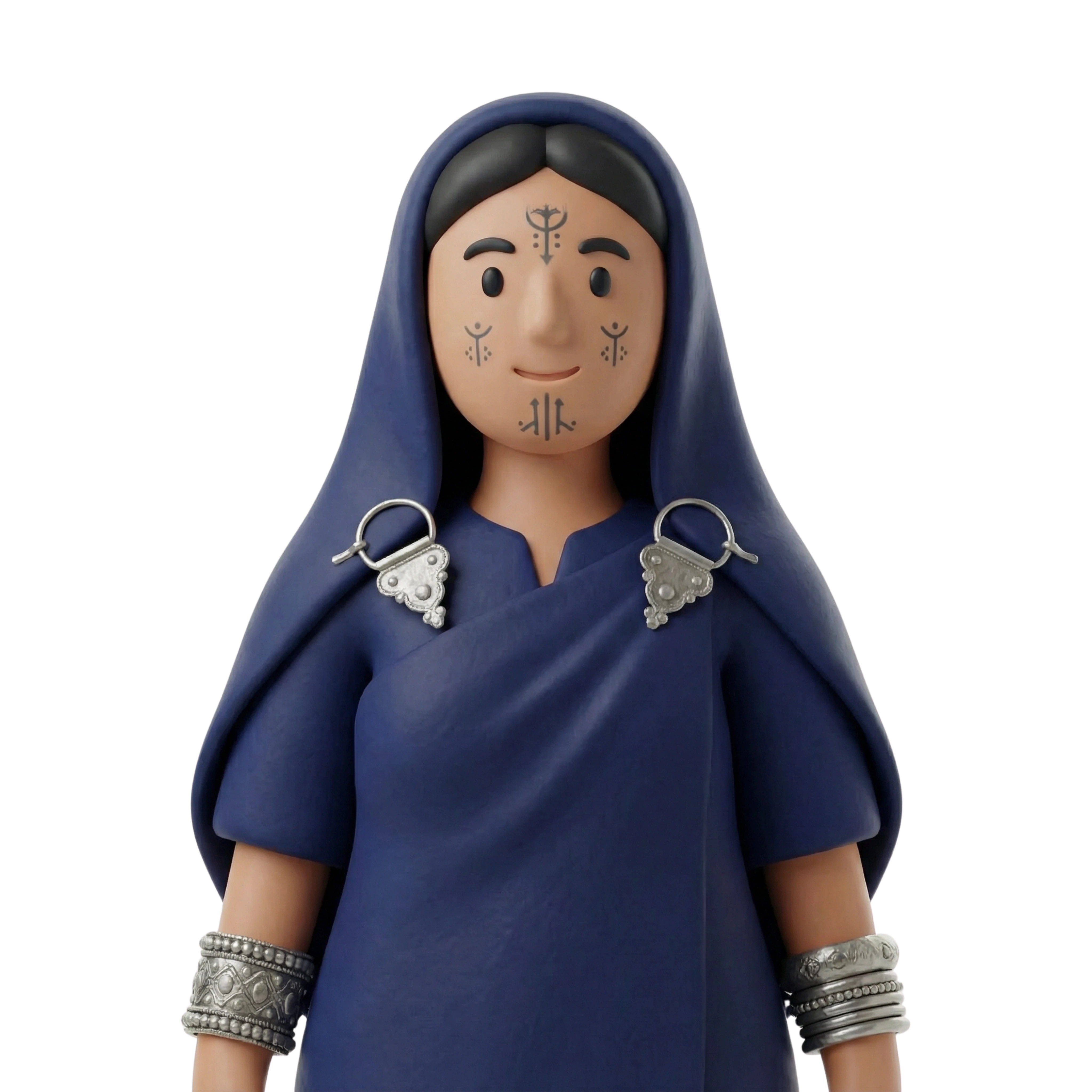 A proud Chaouia woman from the Aurès Mountains of Algeria, dressed in traditional Berber attire with intricate silver accessories and symbolic facial tattoos that reflect her heritage.