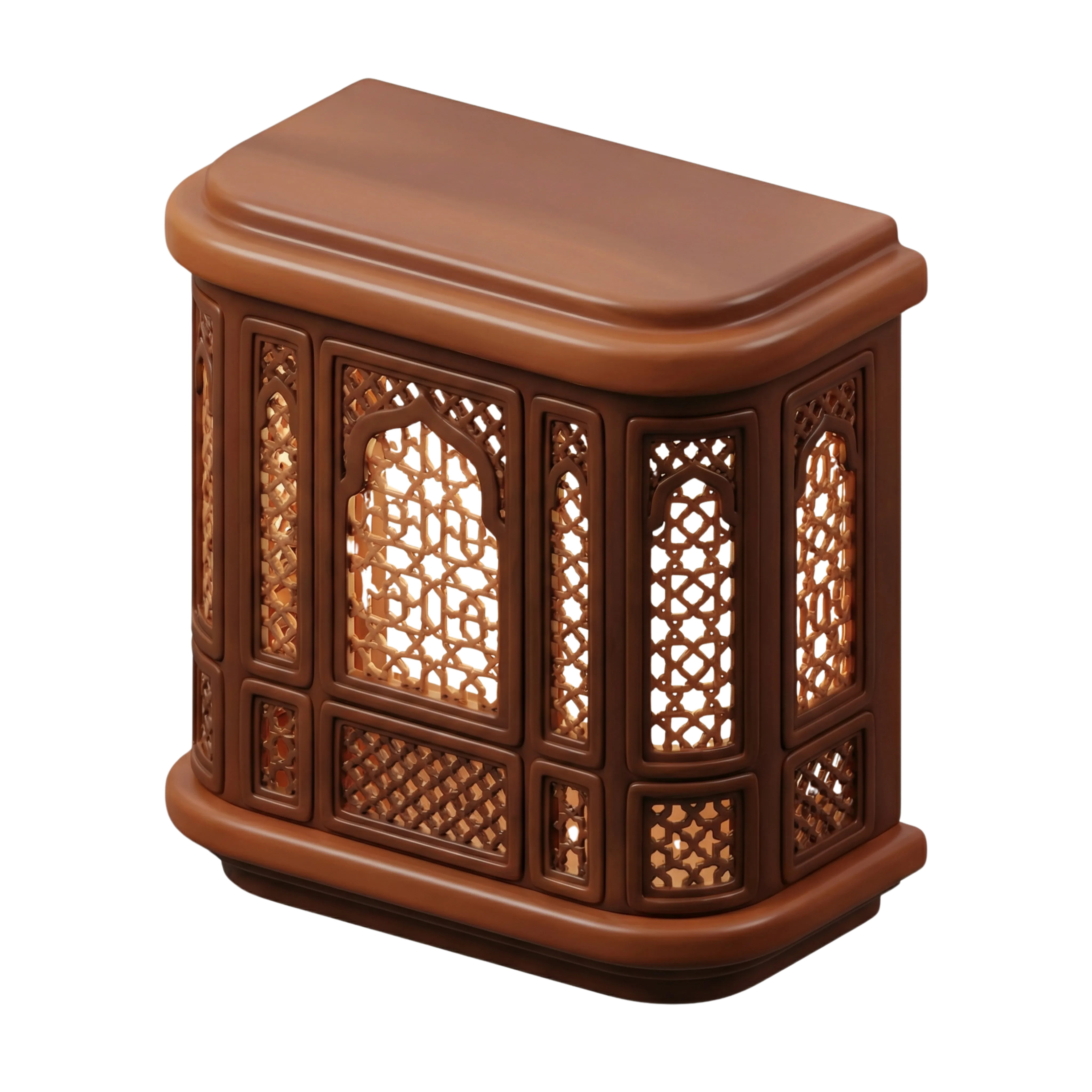 A high-quality 3D render of a traditional Levantine-style wooden balcony. Featuring intricate latticework and arched patterns, the piece has a matte wood finish that enhances its cultural authenticity. Ideal for architectural visualizations, historical reconstructions, or themed digital environments.
