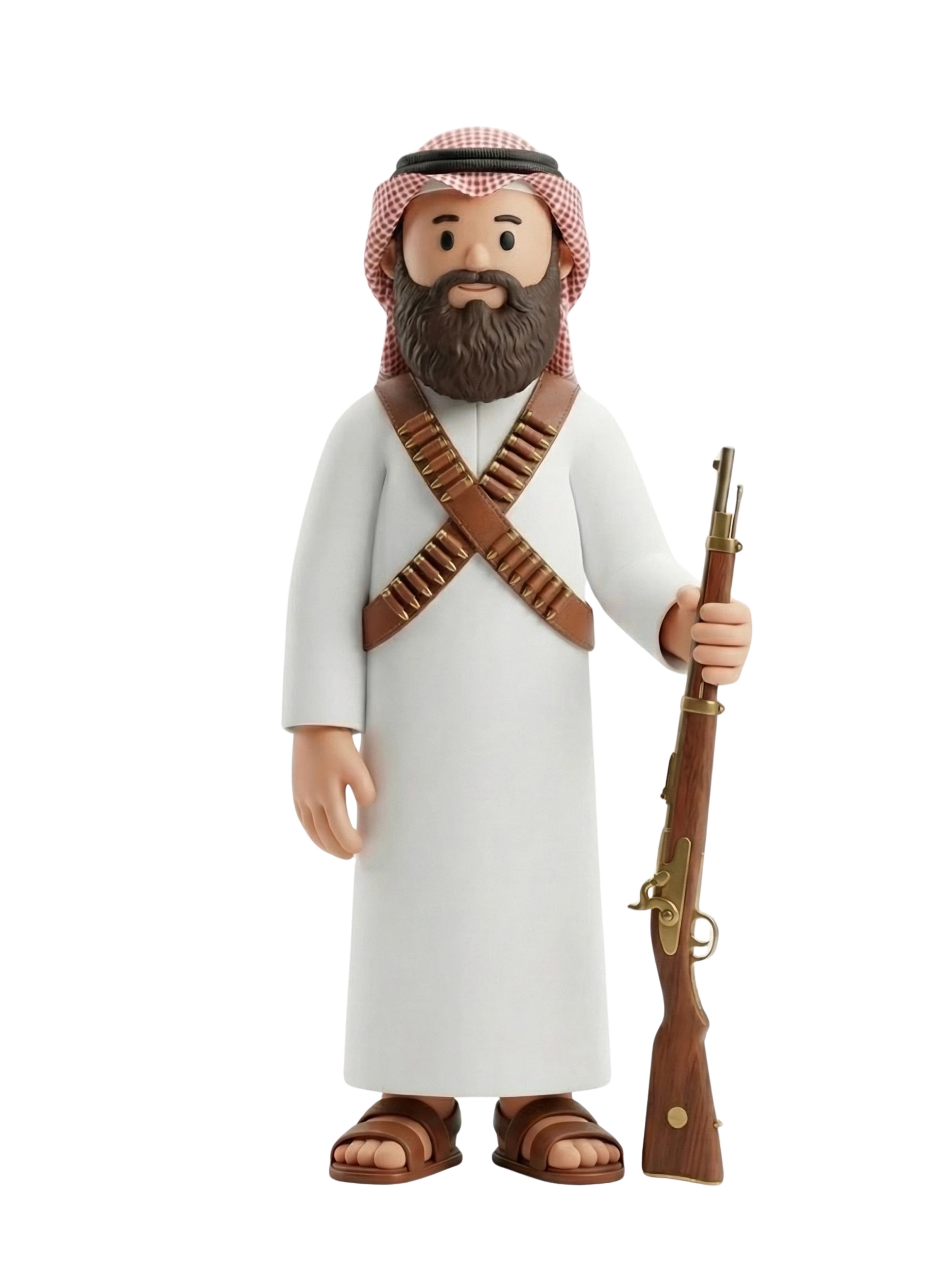 A vigilant Bedouin tracker stands ready with a traditional musket, donning Saudi attire with crossed bandoliers, symbolizing his heritage, survival skills, and protection role in vast desert terrains.