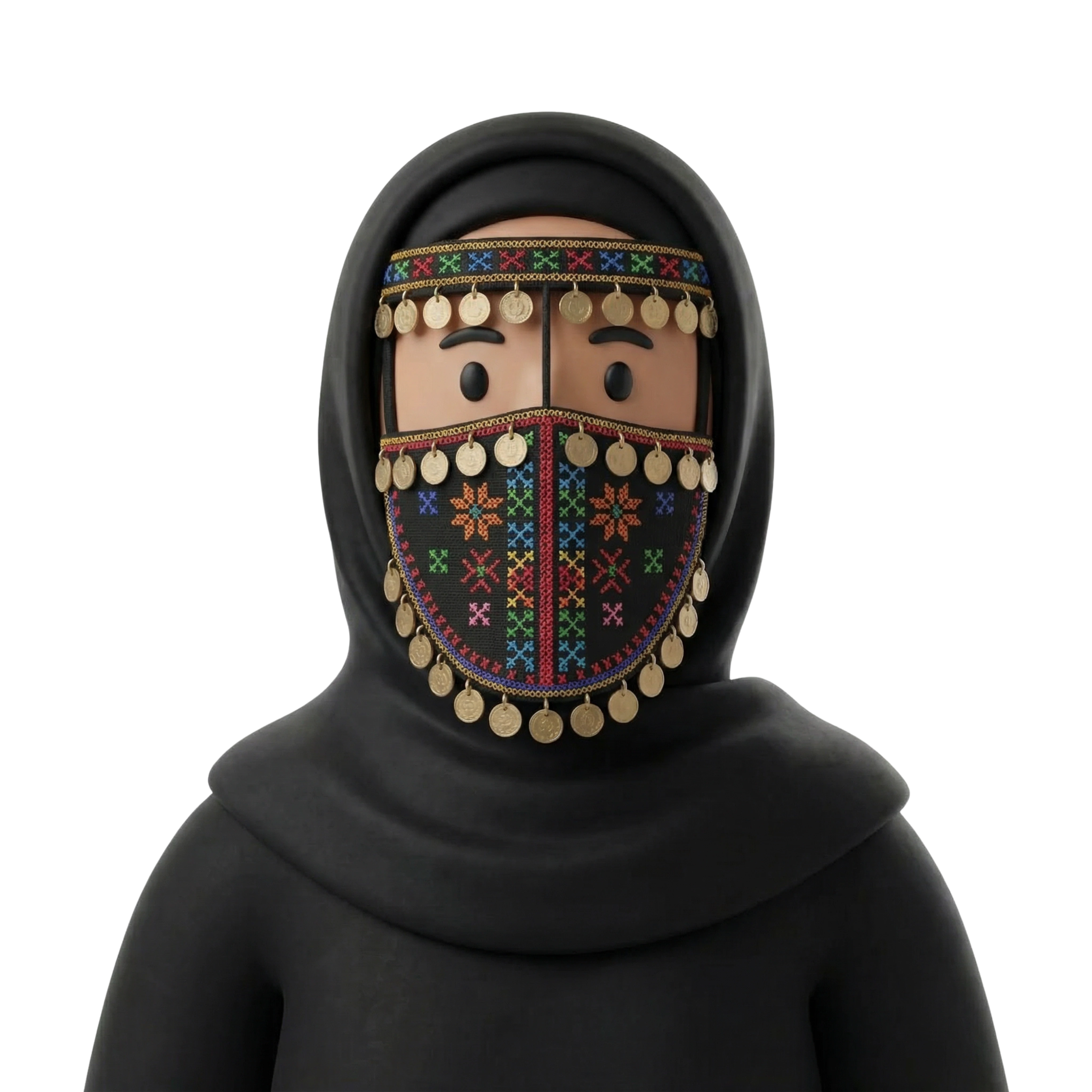 A culturally rooted Bedouin woman from Sinai depicted in vibrant traditional attire, featuring intricate embroidery and ornamental coins that highlight ancestral heritage and desert identity.
