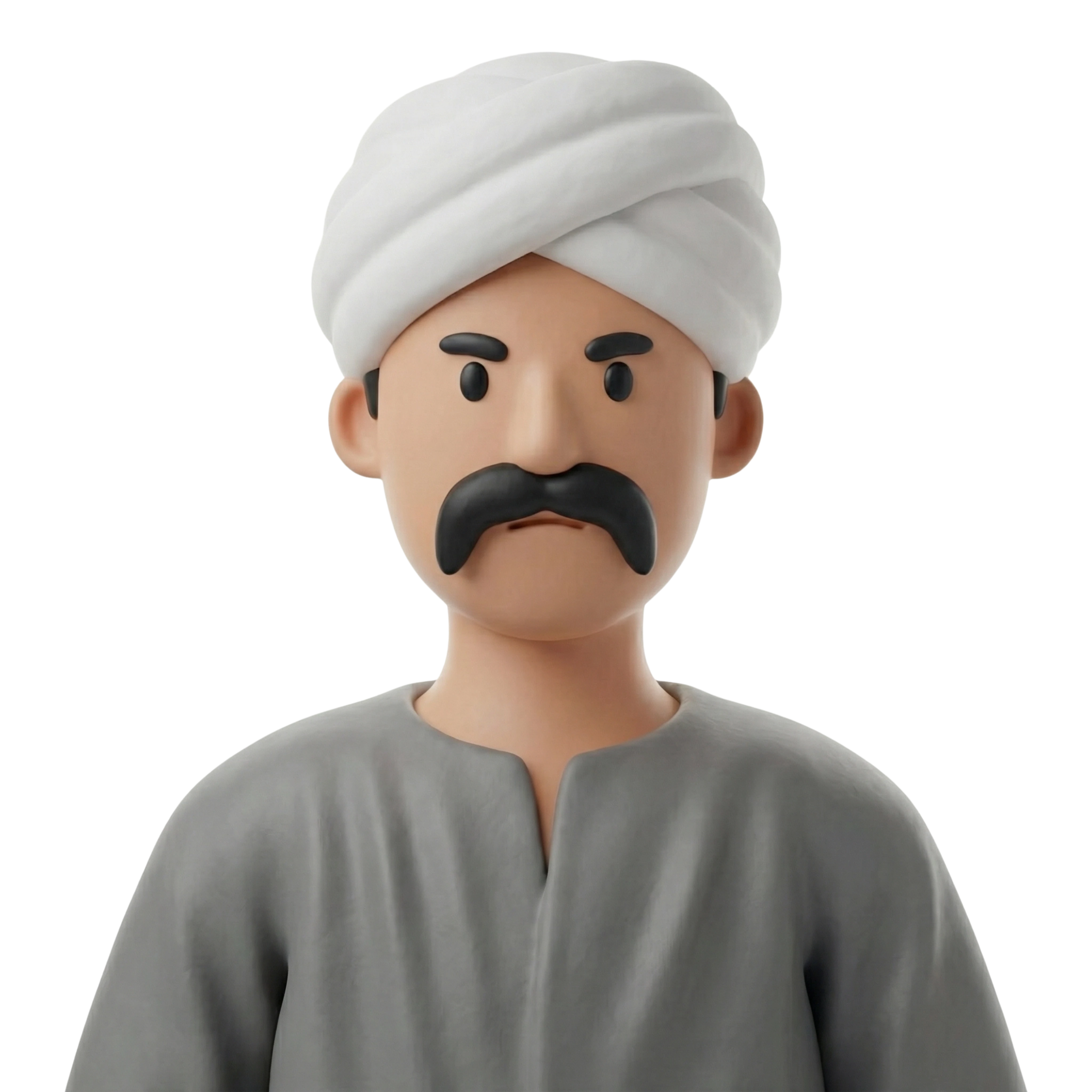 فلاح مصري يقف بملامح جادة، يرتدي جلابية رمادية وعمامة بيضاء، يعكس تقاليد الريف وعبق التراث الزراعي.