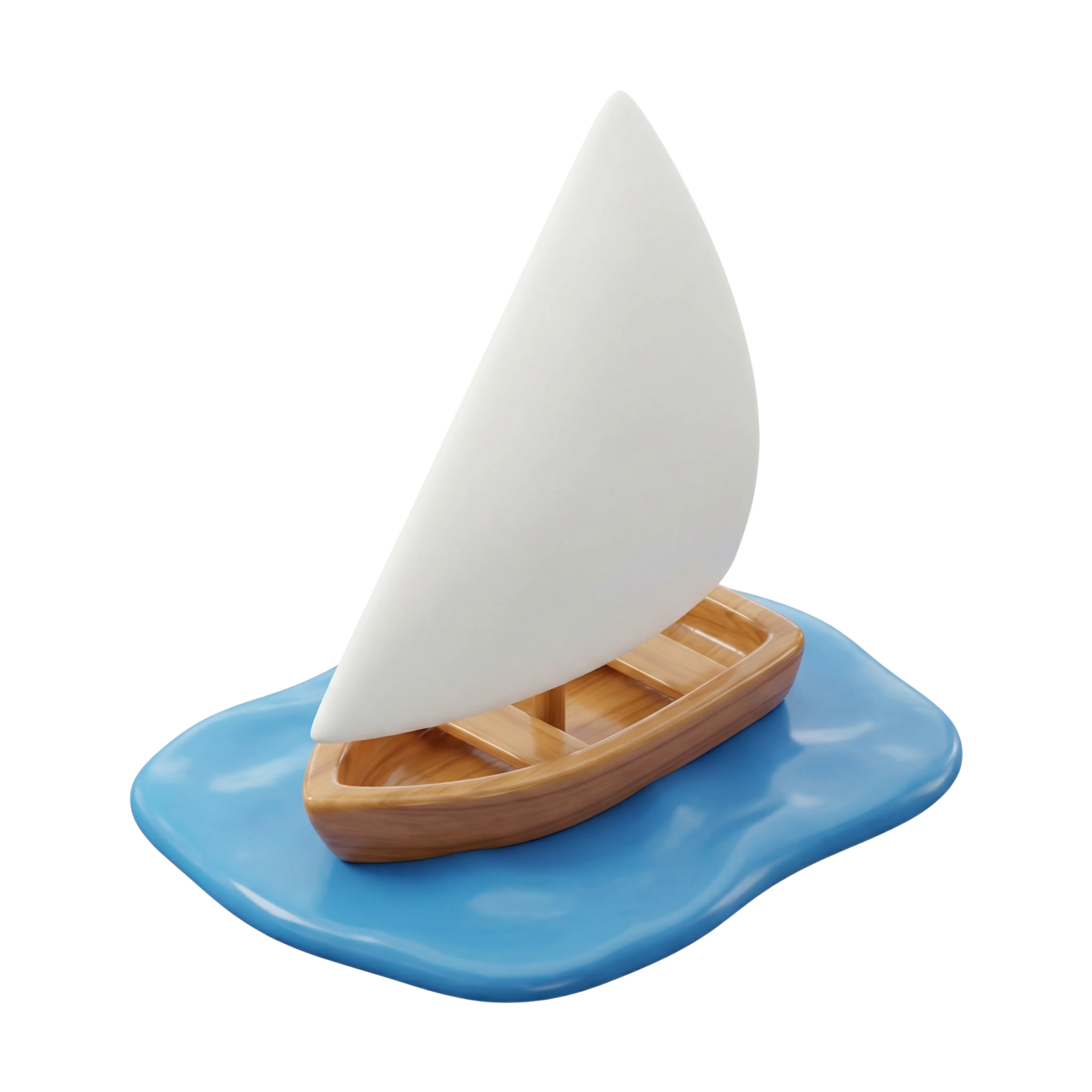 مجسم ثلاثي الأبعاد مفصل لفلوكة مصرية تقليدية، بهيكل خشبي وشراع مثلثي أبيض غير لامع، موضوعة على سطح ماء مصمم بشكل فني. مثالي للاستخدام في التصاميم الثقافية، والعروض التاريخية، والوسائط التعليمية المتعلقة بتراث نهر النيل والملاحة في الشرق الأوسط.