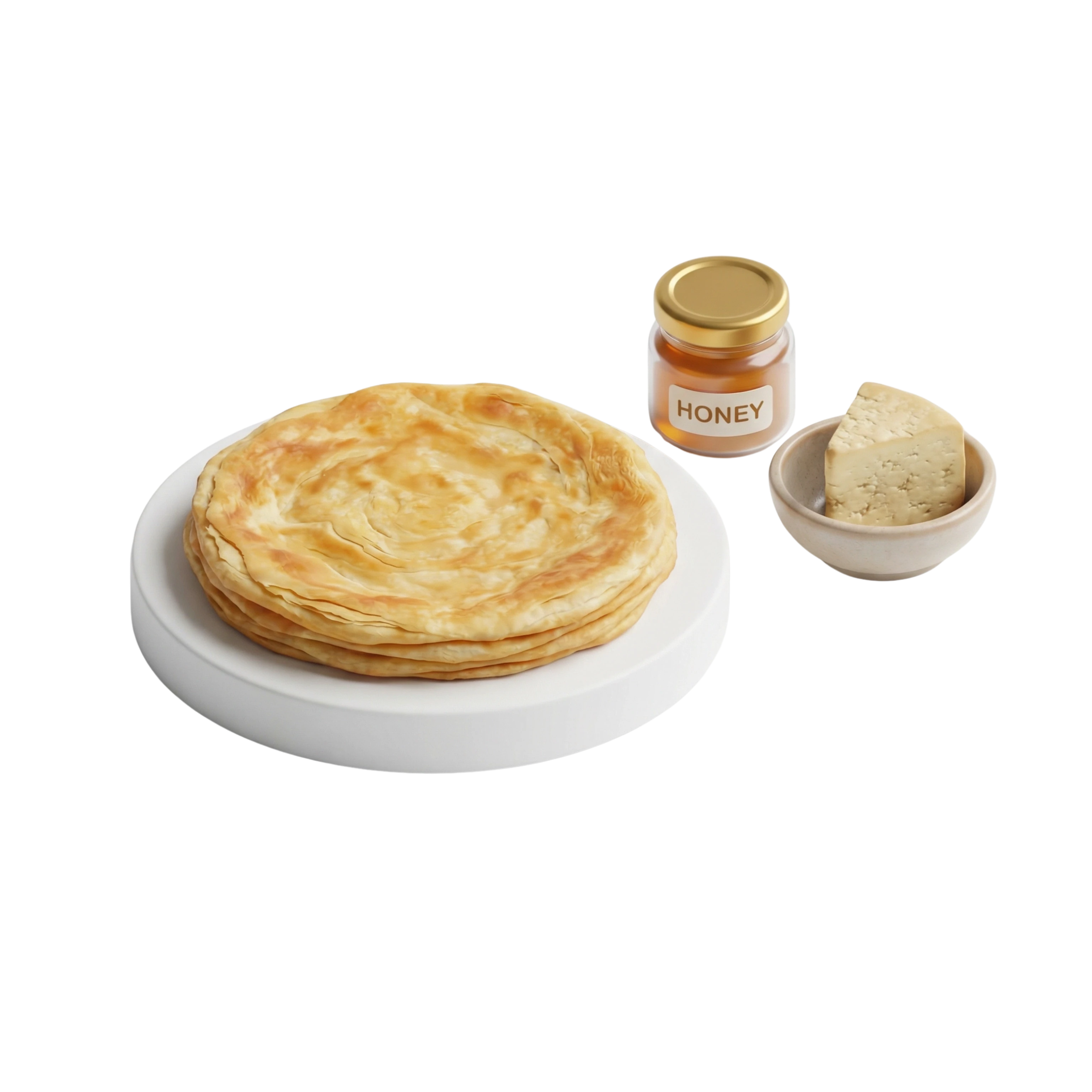 الفطير المشلتت هو معجن مصري تقليدي غني بطبقاته المقرمشة من الخارج والهشة من الداخل. يُقدم عادة مع إضافات حلوة أو مالحة، وكما هو موضح هنا يُقدم مع العسل الحلو والجبن الأبيض المالح، لمزيج رائع من القرمشة والنكهات المتنوعة.