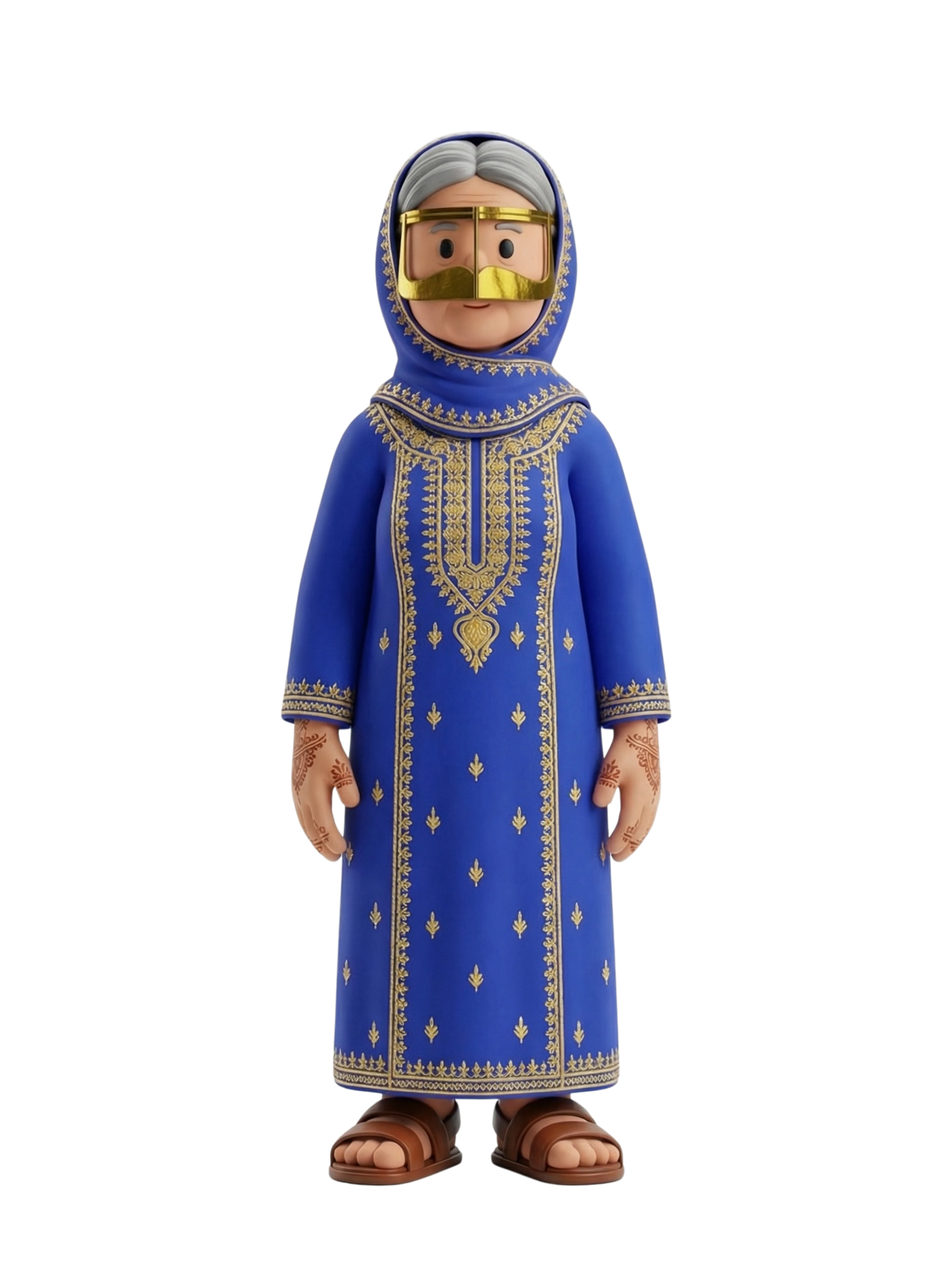 جدة إماراتية فخورة ترتدي كندورة زرقاء تقليدية مطرزة بالذهب، مع برقع وجه تراثي ونقوش حناء، تجسد الأناقة والأصالة في الثقافة الإماراتية.